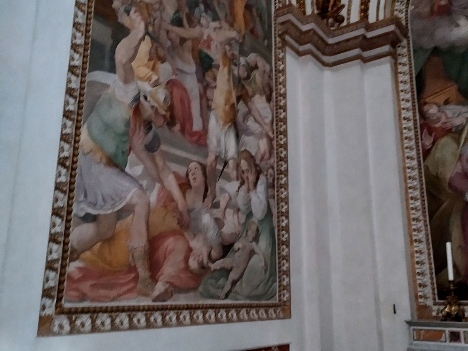 Фреска «Избиение невинных младенцев» рассказывает о библейском эпизоде из Евангелия от Матфея, когда иудейский царь Ирод Великий, узнав от волхвов о грядущем рождении мессии, испугался конкуренции и приказал своим воинам убить в Вифлееме всех мальчиков в возрасте до двух лет. Но Иисус был спасен. Согласно евангельскому преданию, его спас Иосиф Обручник, которому явился во сне ангел и сказал: «Встань, возьми младенца и матерь его и беги в Египет, и будь там, доколе не скажу тебе». Богословы указывают различное число убиенных младенцев – в византийской традиции принята цифра 14 тысяч. На фреске представлен эпизод противостояния матерей и воинов, пришедших по приказу царя Ирода истребить младенцев. На первом плане видим, как одна женщина протягивает руку к убийце с мольбой пощадить ее ребенка, а другая застыла в ужасе, глядя на бездыханное тело своего младенца.