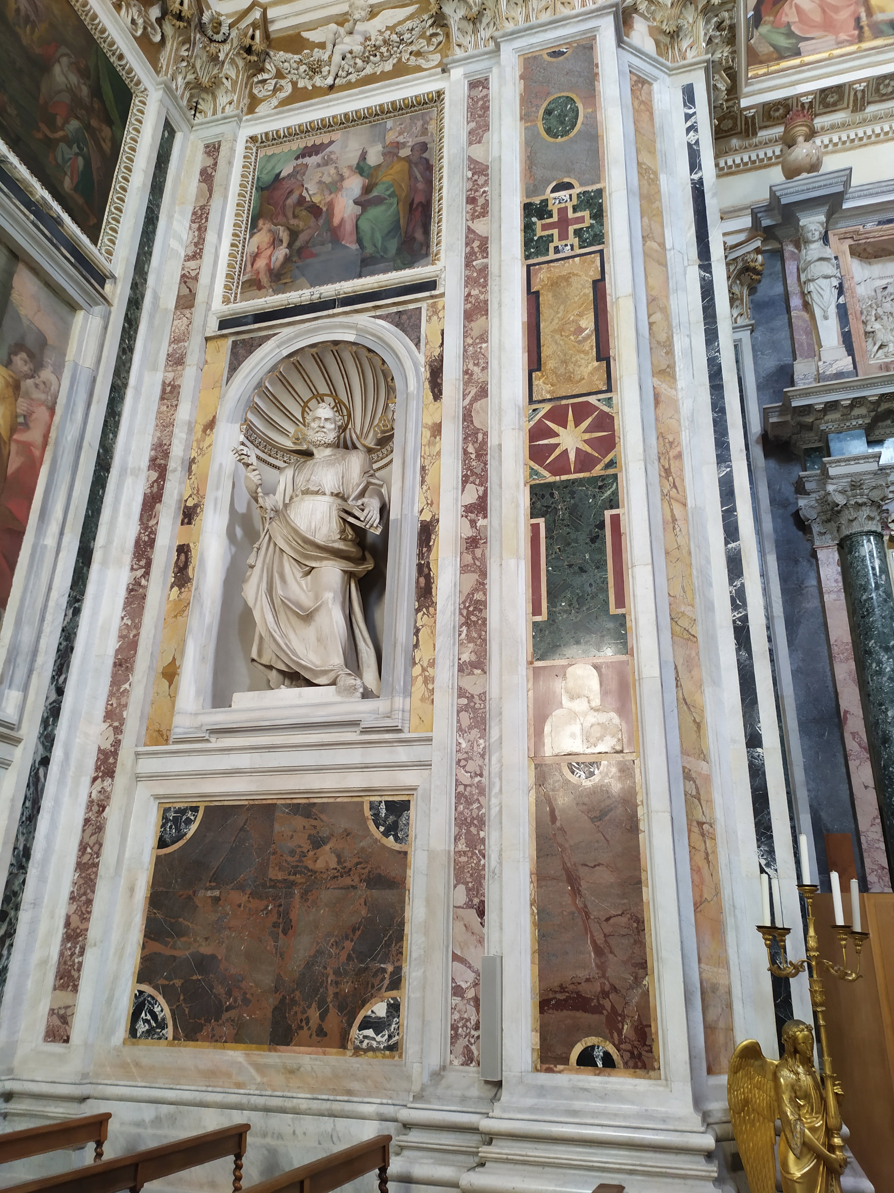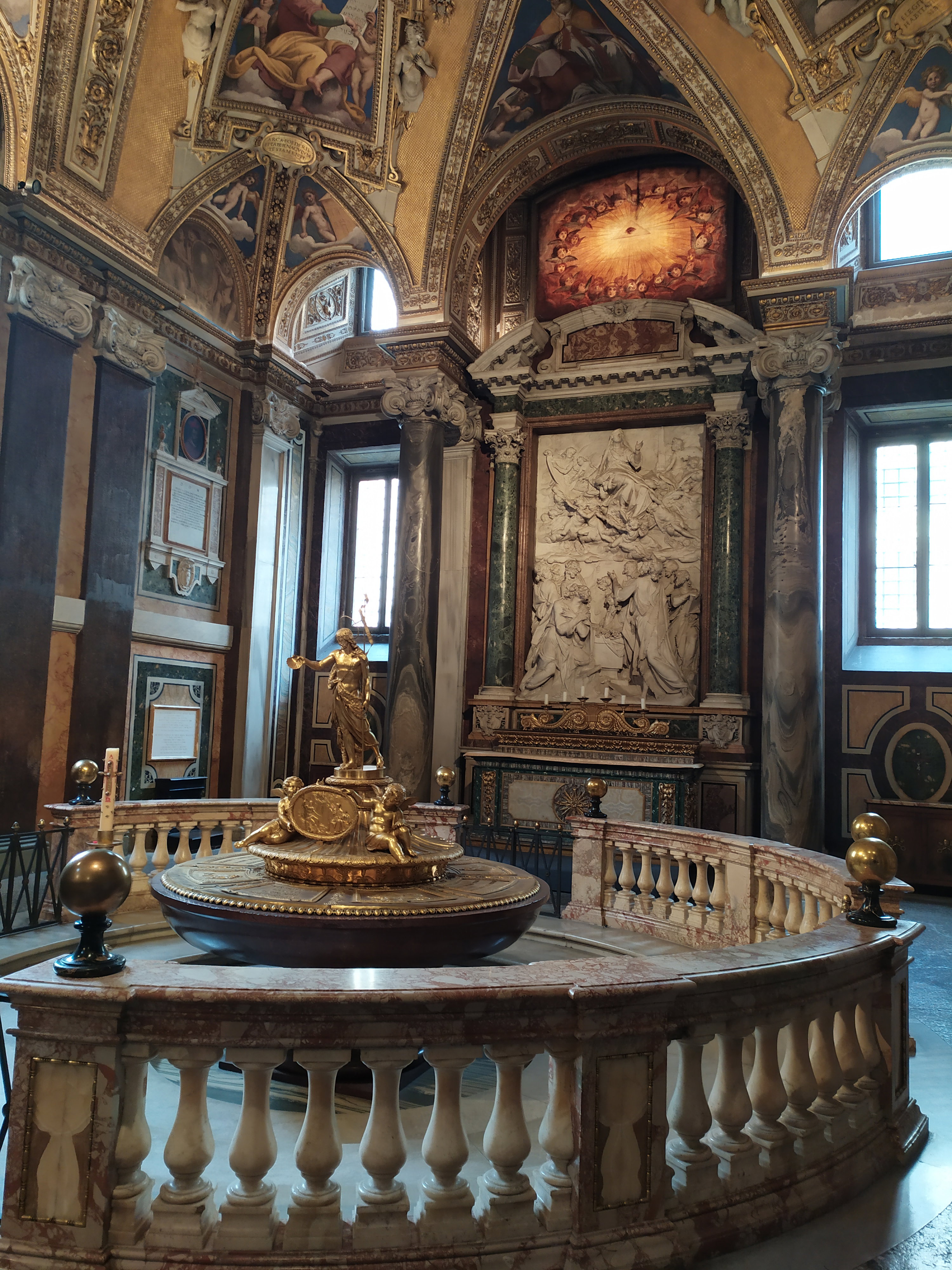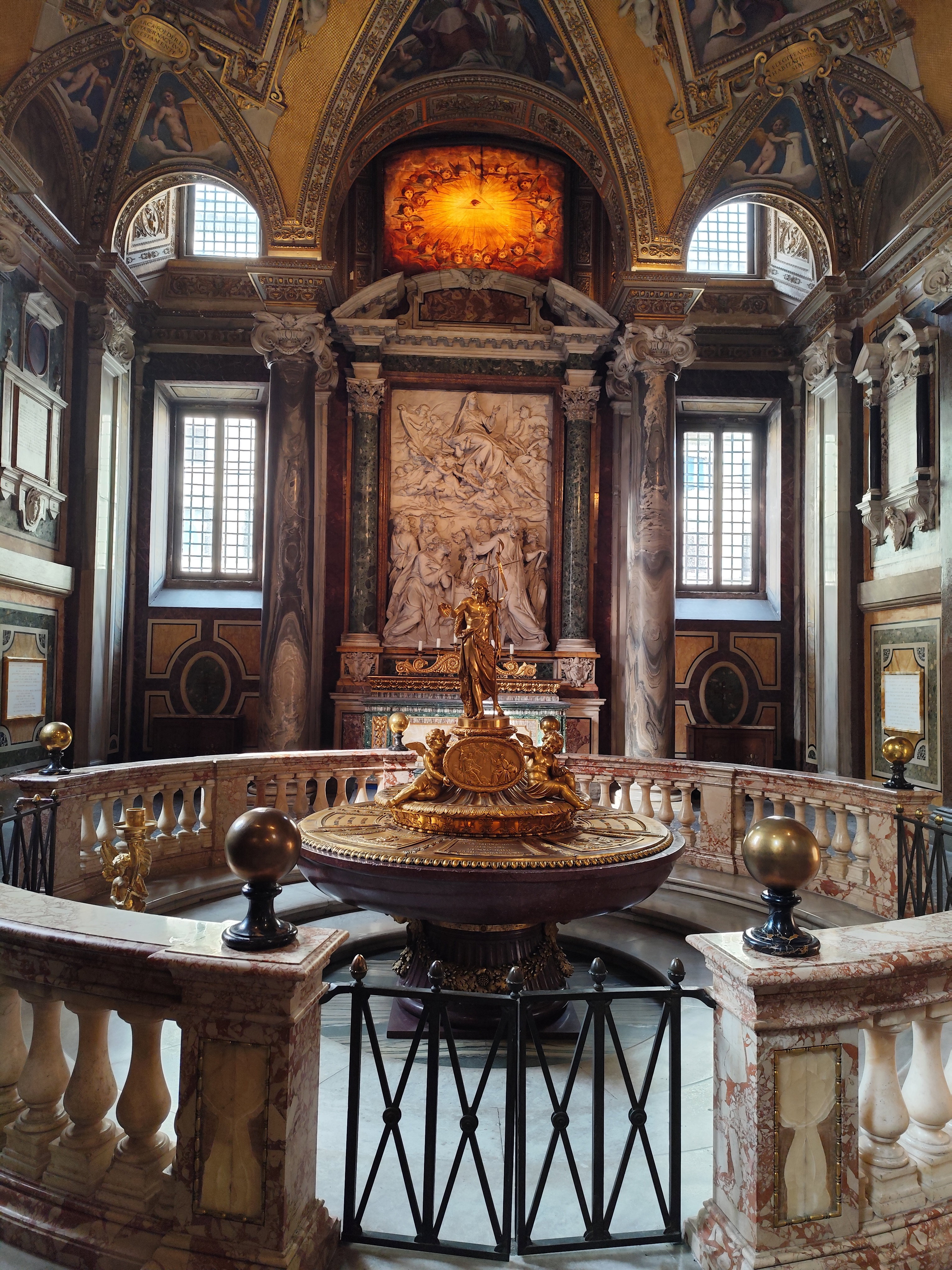 Крестильная купель из красного порфира, огражденная мраморной балюстрадой, была украшена в 1800 году позолоченной скульптурой Иоанна Крестителя, созданной известным архитектором и ювелиром Джузеппе Валадье по заказу папы Пия IX. На алтарной стене размещен мраморный барельеф «Успение Девы Марии», созданный Пьетро Бернини, отцом гения – Джованни Лоренцо Бернини. Дева Мария изображена в окружении ангелов, которые готовятся перенести ее тело на небеса на глазах изумленных апостолов.