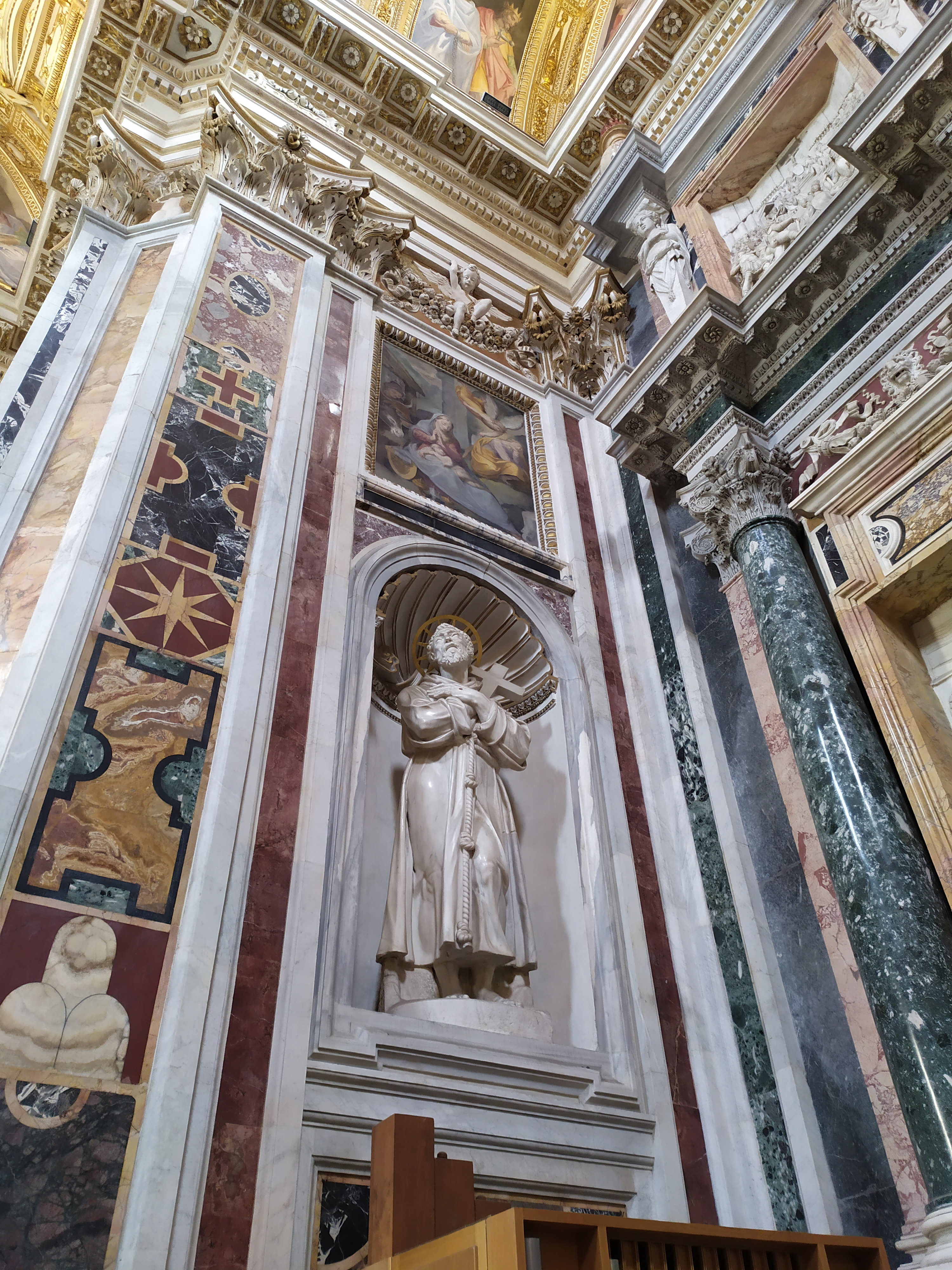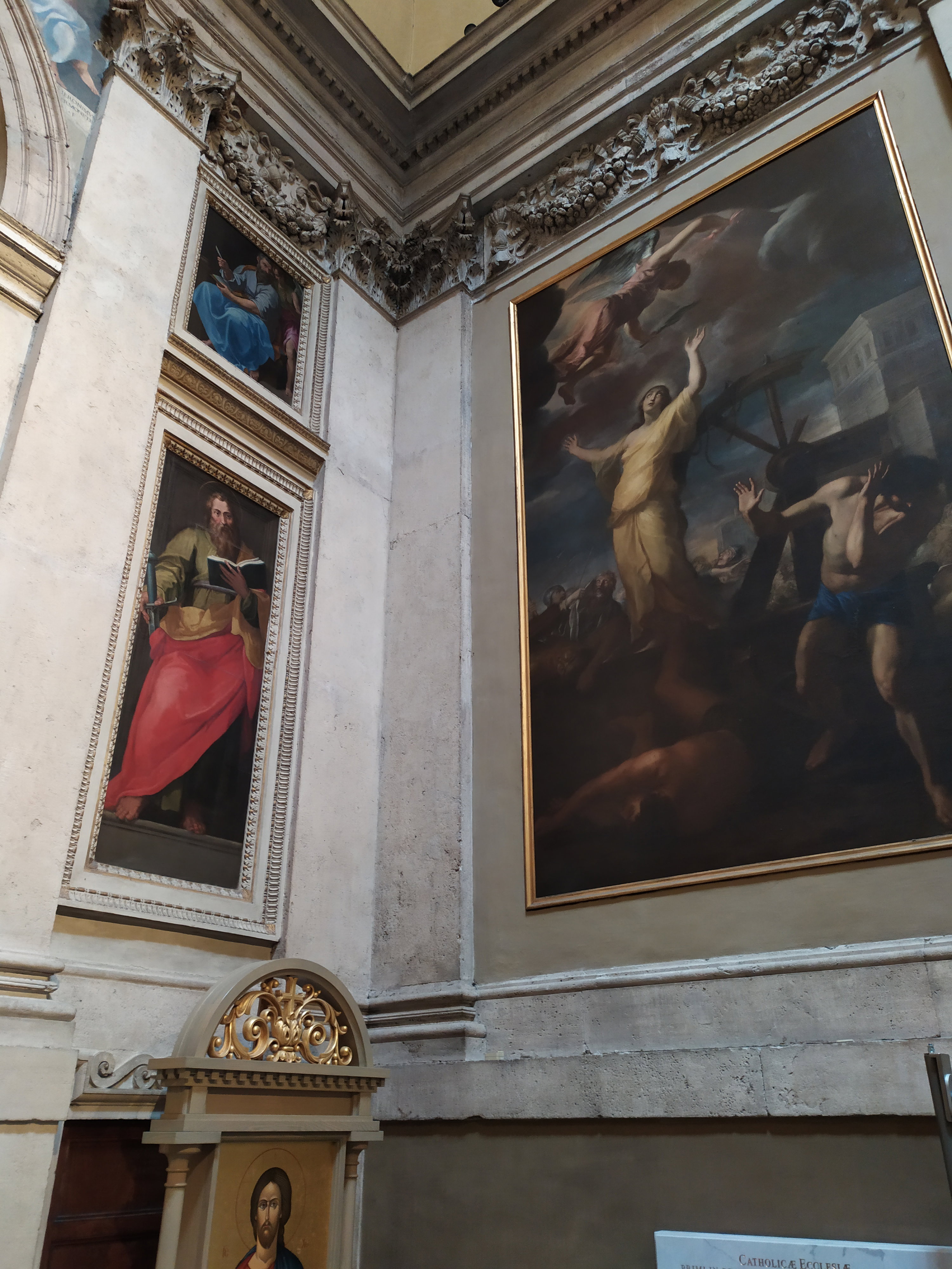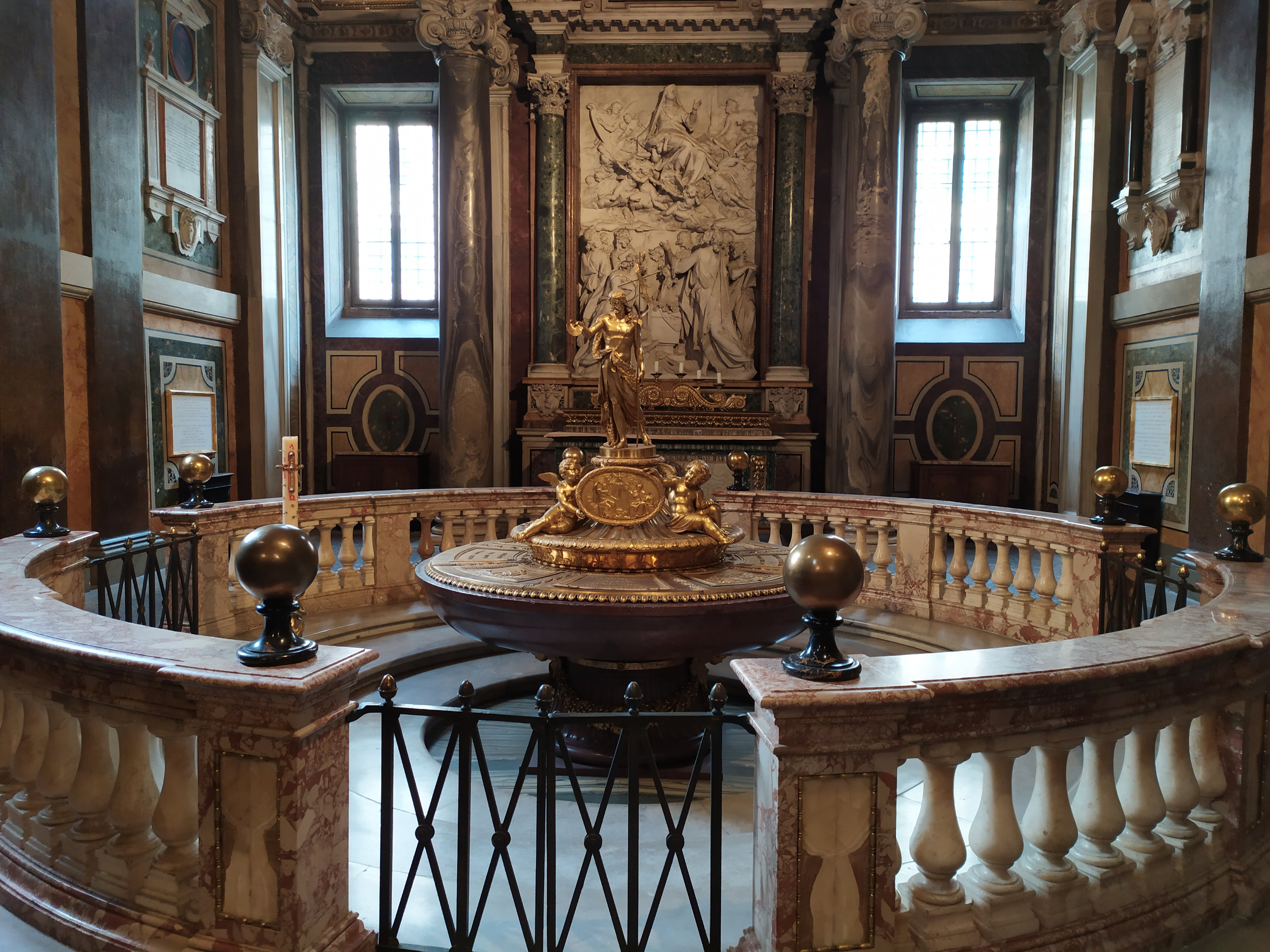 Крестильная купель из красного порфира, огражденная мраморной балюстрадой, была украшена в 1800 году позолоченной скульптурой Иоанна Крестителя, созданной известным архитектором и ювелиром Джузеппе Валадье по заказу папы Пия IX. На алтарной стене размещен мраморный барельеф «Успение Девы Марии», созданный Пьетро Бернини, отцом гения – Джованни Лоренцо Бернини. Дева Мария изображена в окружении ангелов, которые готовятся перенести ее тело на небеса на глазах изумленных апостолов.