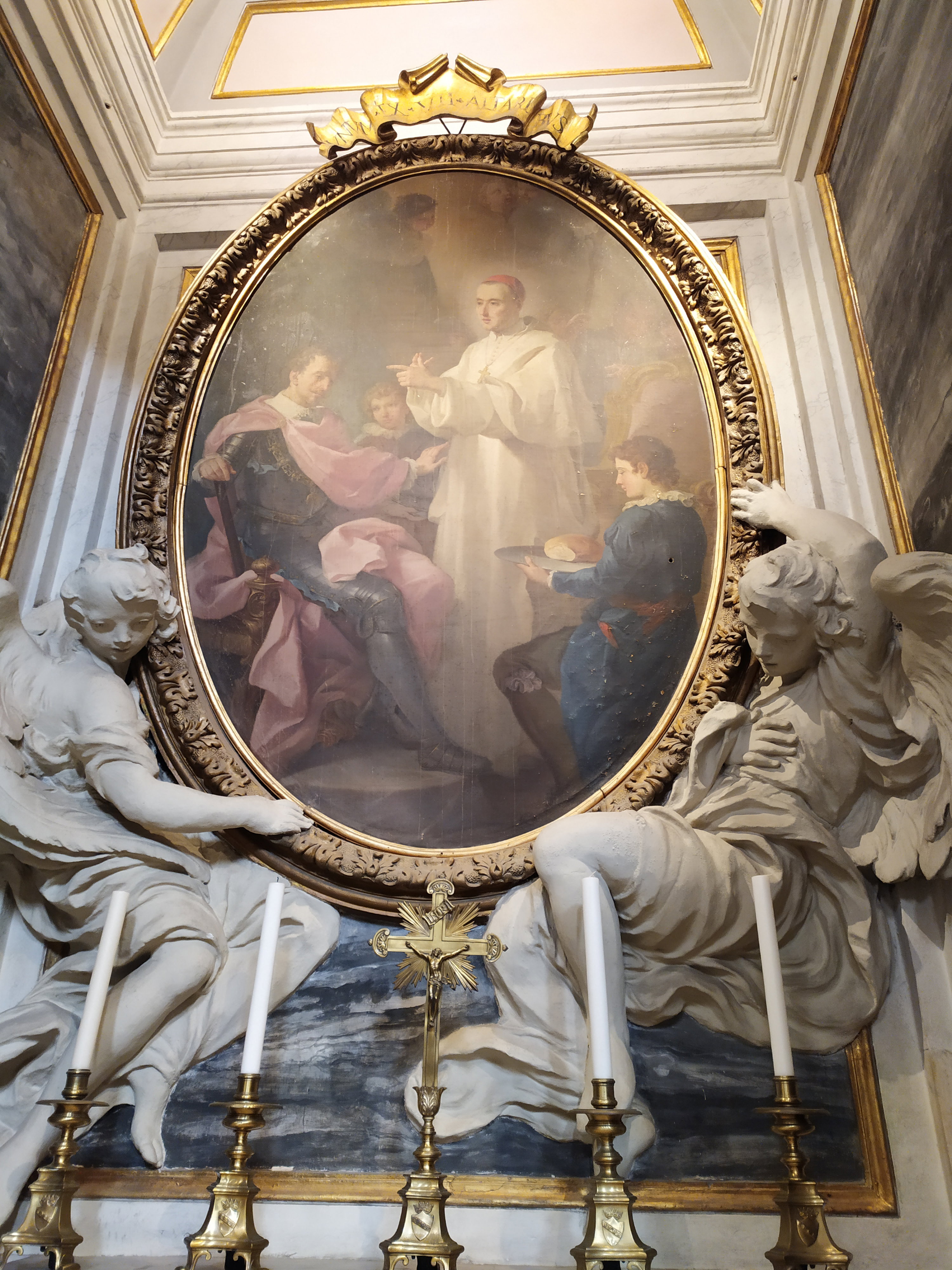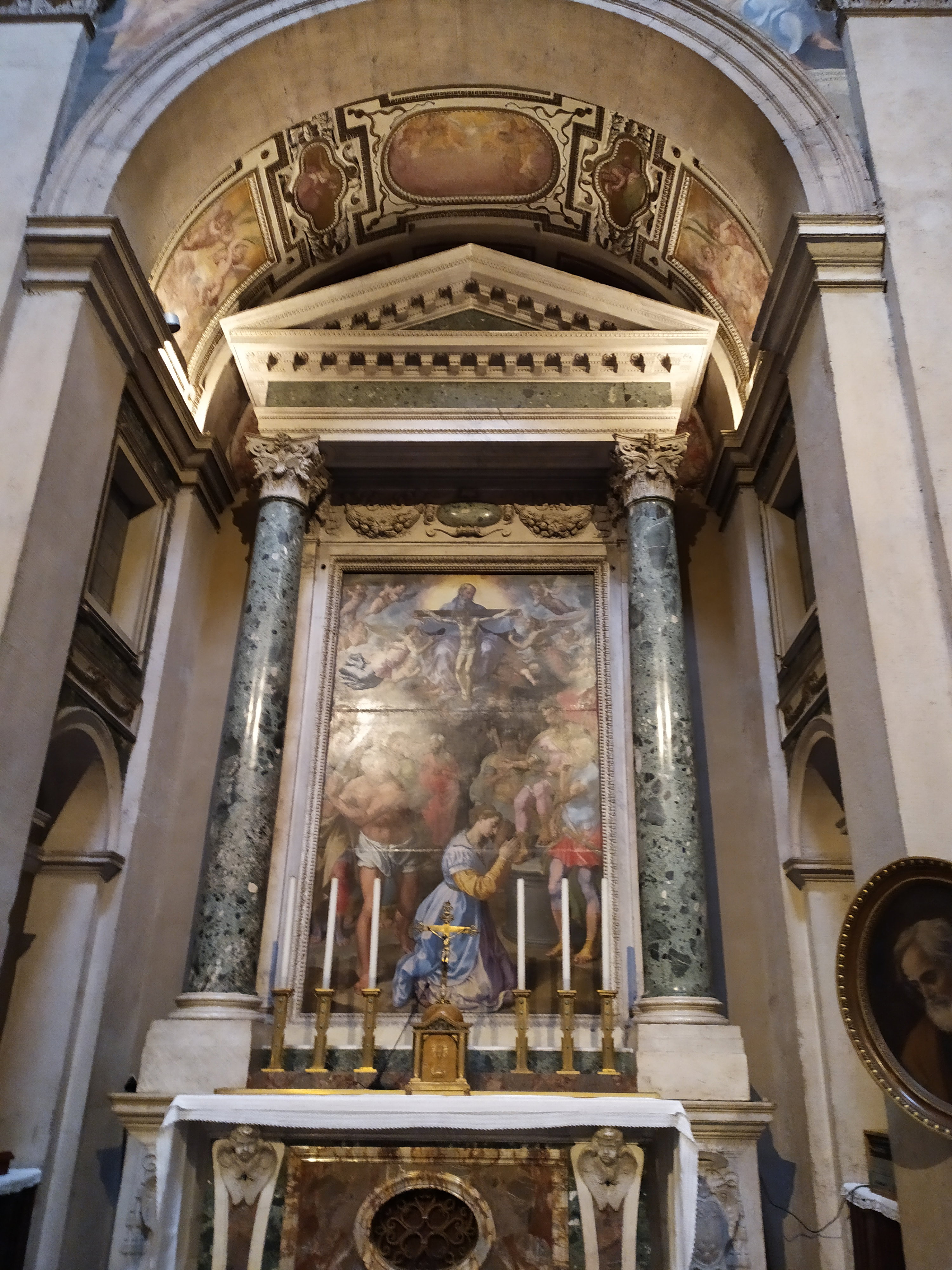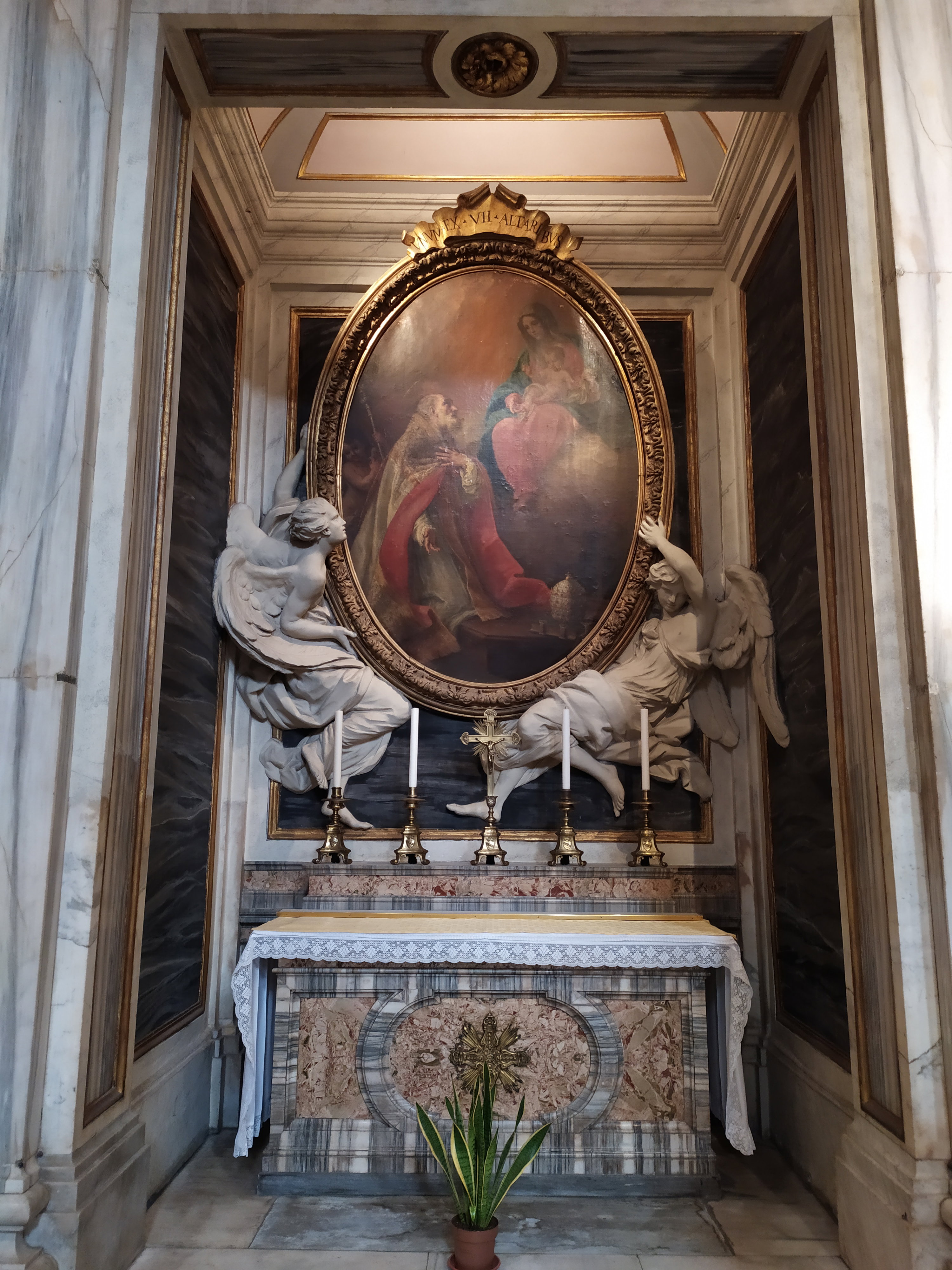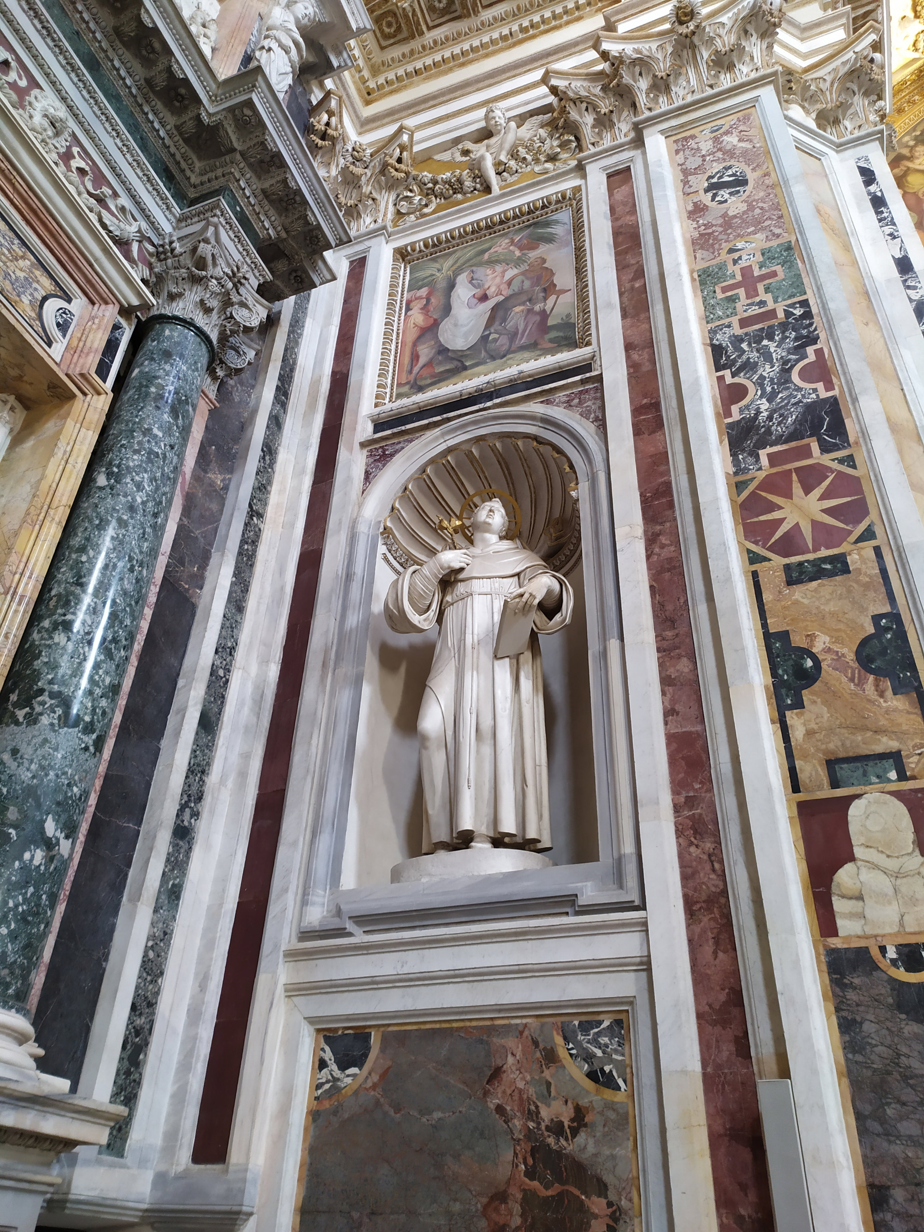 Алтарные образы в виде овальных медальонов не выделяются и не привлекают к себе внимание, но гармонично вписываются в общую картину гигантского интерьера базилики. Фрески написаны в 18 веке разными художниками, а фигурки ангелочков для всех алтарных образов создал Пьетро Браччи, автор известной скульптуры Нептуна для фонтана Треви. Алтарная фреска, посвященная кардиналу Никколо Альбергати, отражает историческое событие 1431 года, когда Альбергати, как дипломат Ватикана, посетил дворы Бургундии, Англии и Франции, предлагая посредничество и мирные решения для прекращения Столетней войны 1337-1453 годов.