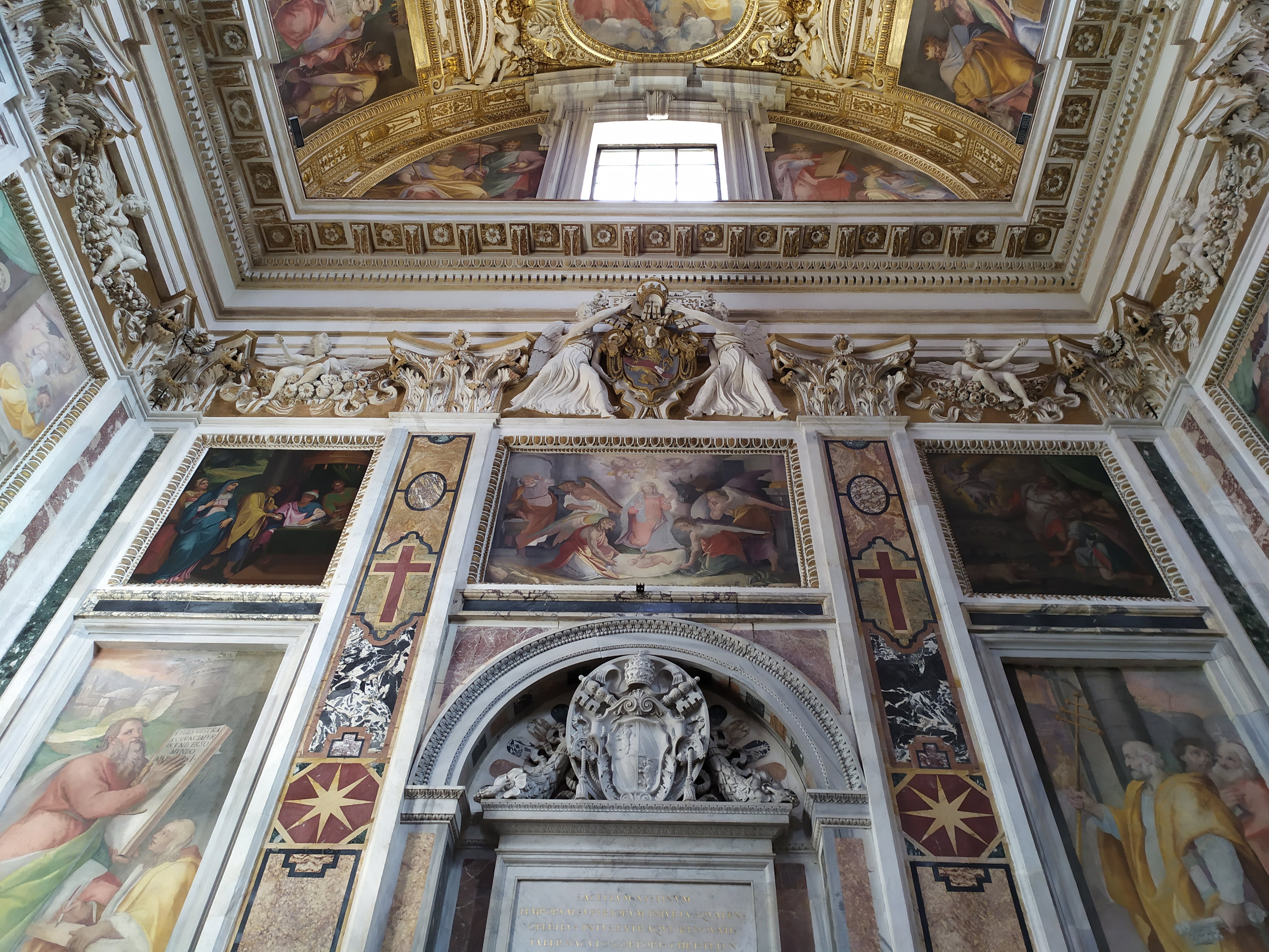 На центральной фреске изображена Дева Мария в окружении четырех римских отцов церкви (Амвросий Медиоланский, Иероним Стридонский, Августин Блаженный и Григорий Великий) и четырех великих пророков (Исаия, Иеремия, Даниил и Иезекииль), которые, как утверждал Пий IX, издревле хранили и защищали учение о непорочном зачатии Девы Марии. Однако, предание говорит противное – до 11 века никто вовсе не касался этого понятия. Интересно, что побудило папу Пия IX изобрести новый догмат в 19 веке? Есть над чем подумать. Православная церковь отвергает догмат о непорочном зачатии Девы Марии, ибо такое учение противоречит концепции всеобщей греховности человеческого рода.
