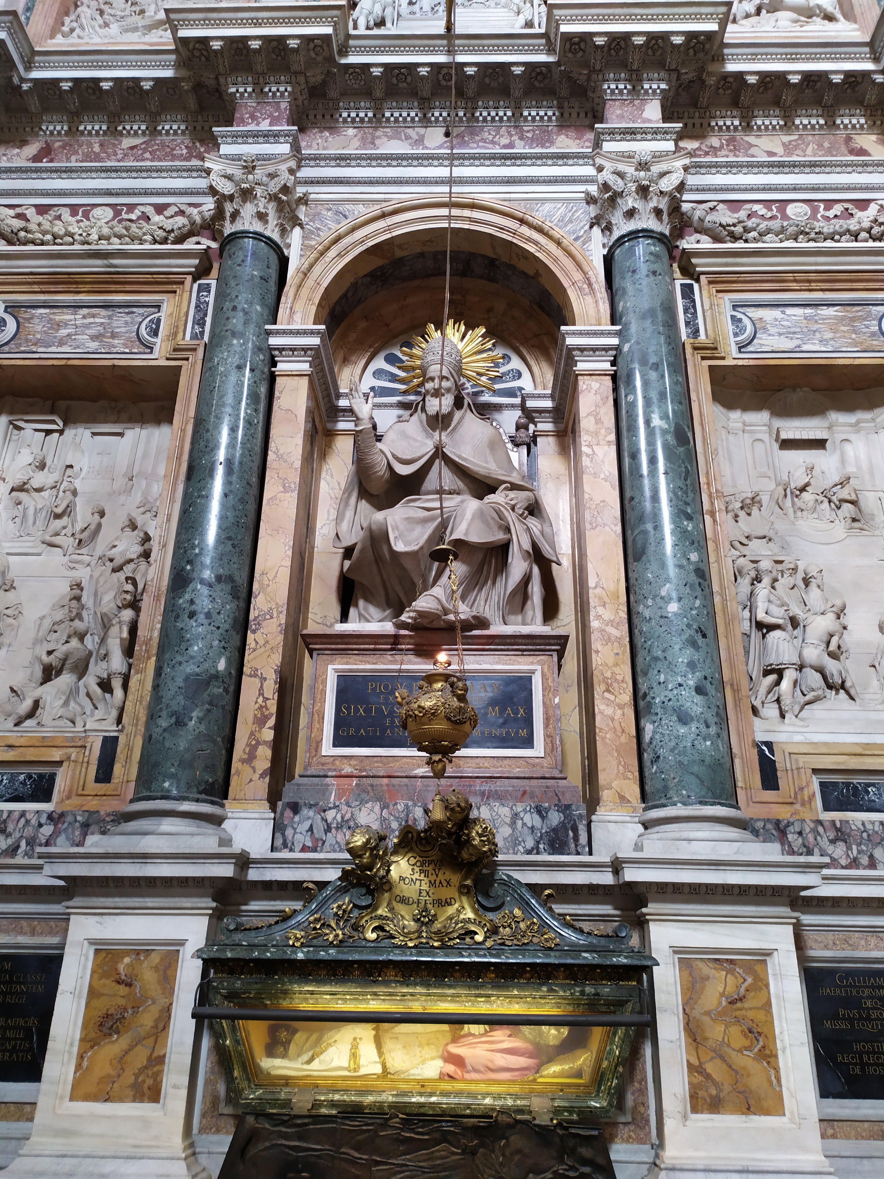 Пий V был умерен в еде и одежде, спал не более 5 часов в сутки, часто ходил пешком, возродил практику регулярного посещения 7 главных базилик Рима. За такой аскетический образ жизни его еще при жизни воспринимали как святого, а после смерти причислили к лику блаженных и канонизировали. Изначально Пия V похоронили в Ватикане, но затем по указу Сикста V останки перенесли в базилику Санта-Мария-Маджоре. Роскошный саркофаг был изготовлен гениальным мастером религиозного жанра, французским скульптором Пьером Ле Гро-младшим. Мощи Пия V облачили в новое епископское одеяние, а череп поместили в серебряную маску. Значительную часть саркофага оставили открытой, чтобы дать доступ к почитанию останков святого Пия V.
