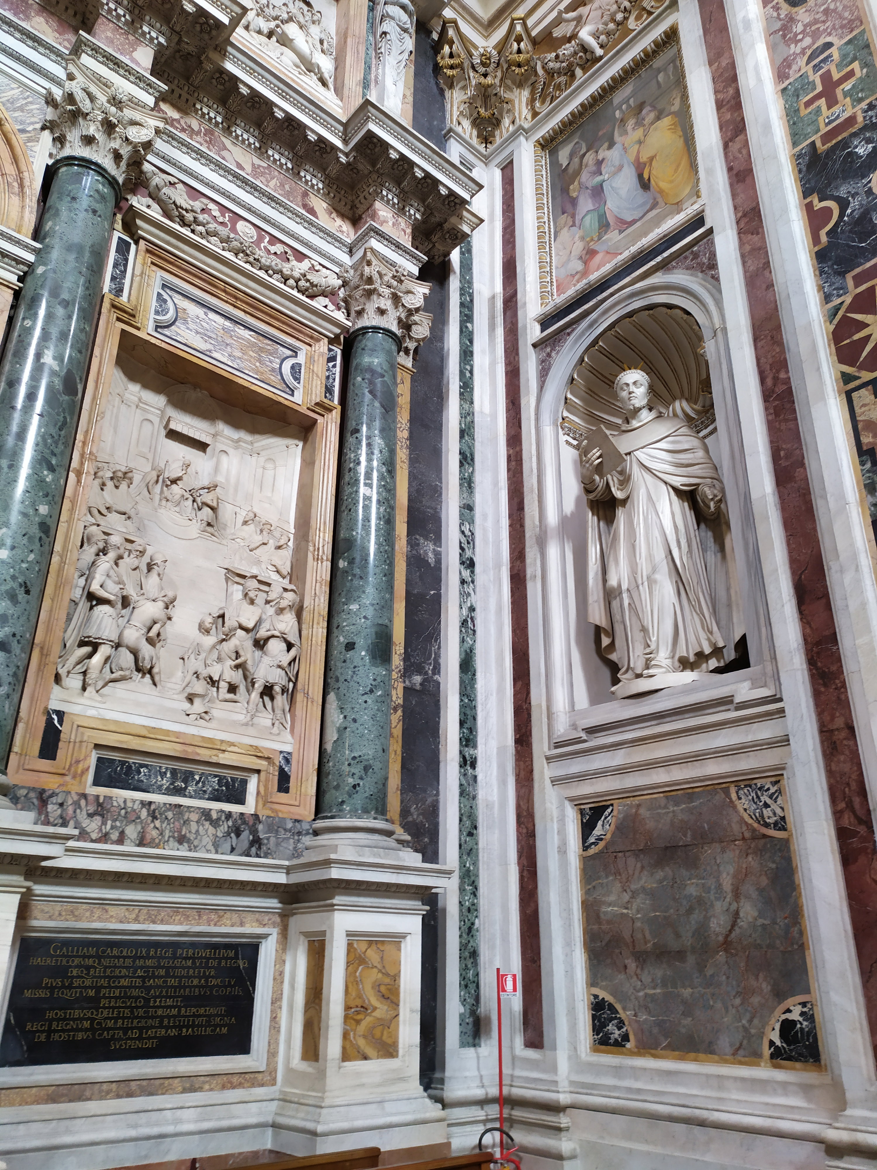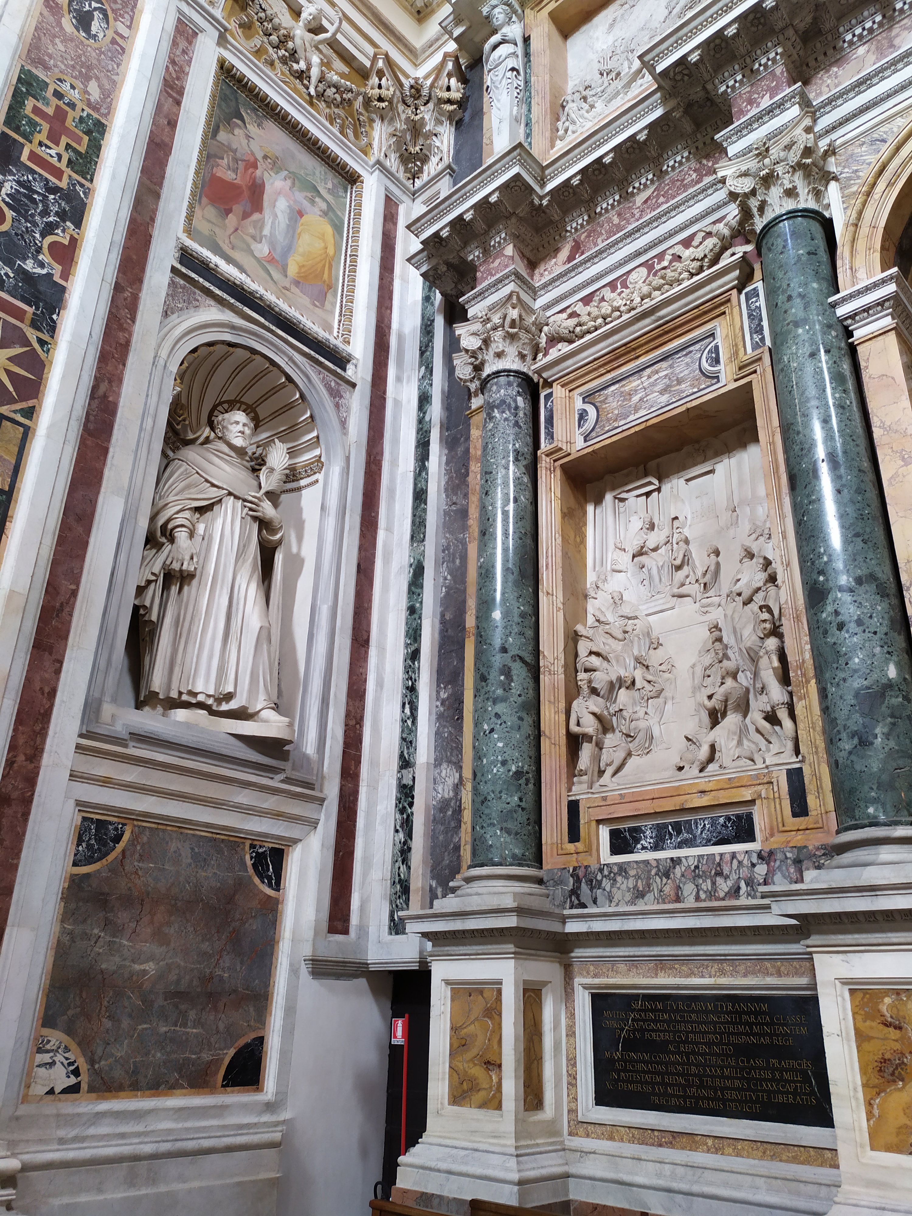 Усыпальницу папы Пия V украшают скульптуры двух доминиканских святых – Петра Веронского и Доминика. Причина их нахождения здесь заключается в том, что Пий V принадлежал к их ордену. Доминиканский проповедник Петр Веронский мало кому известен. Это был ревностный католик, в своих проповедях обличал ересь и яростно боролся с еретиками, считая, что для возвращения их в лоно церкви, можно применять пытки. Современники считали Петра Веронского человеком без сердца. А уж после того, как в 1251 году он был назначен главным инквизитором в Милане и Комо, врагов у него увеличилось. В 1252 году Веронского жестоко убили – нападавший сначала вонзил ему в голову широченный тесак, а затем добил ударом кинжала в сердце. Римский папа Иннокентий IV так разозлился из-за этого убийства, что издал буллу, согласно которой пытки к подозреваемым в ереси еще больше ужесточились, а Петр Веронский был канонизирован как святой Петр-Мученик.