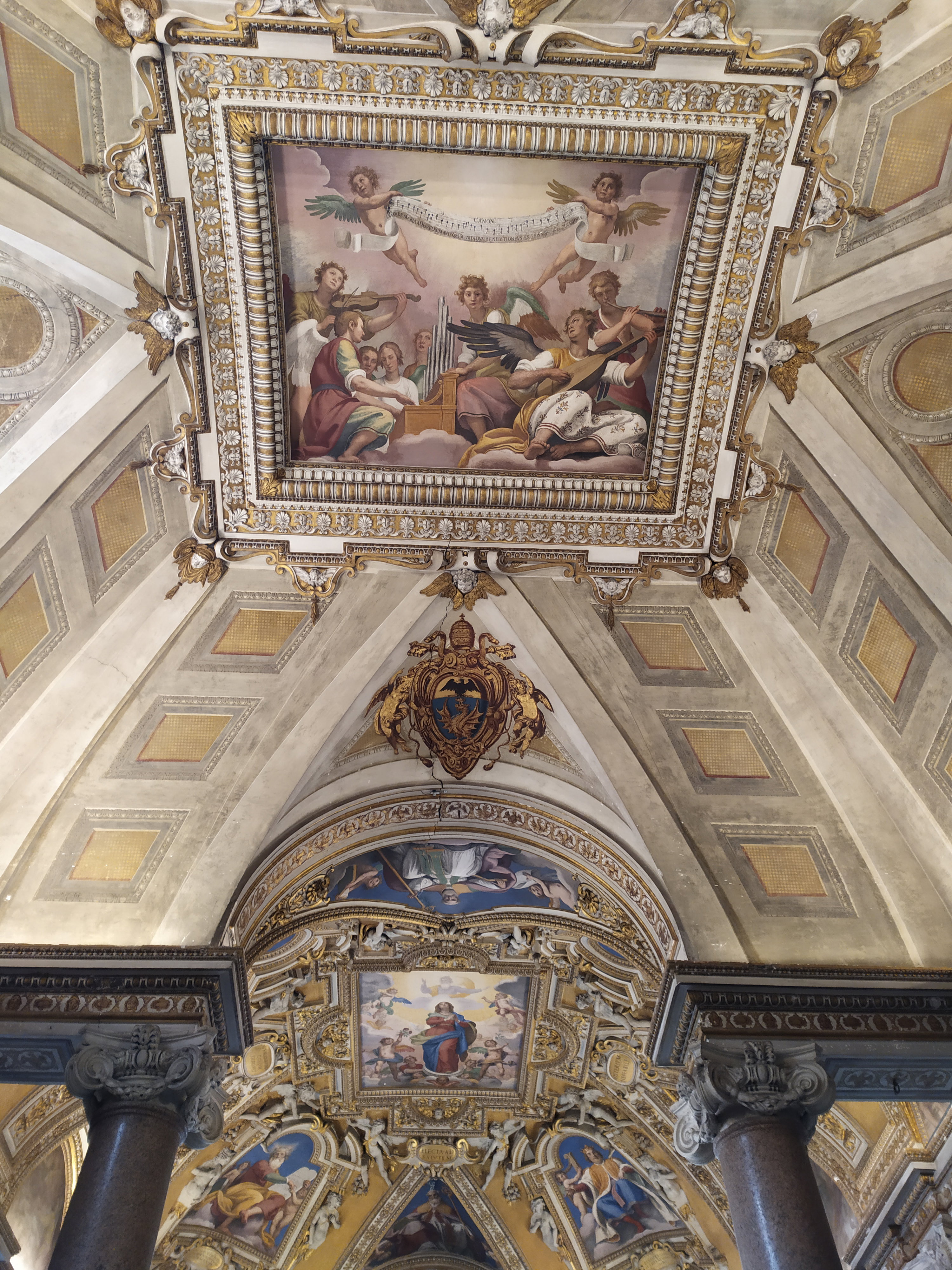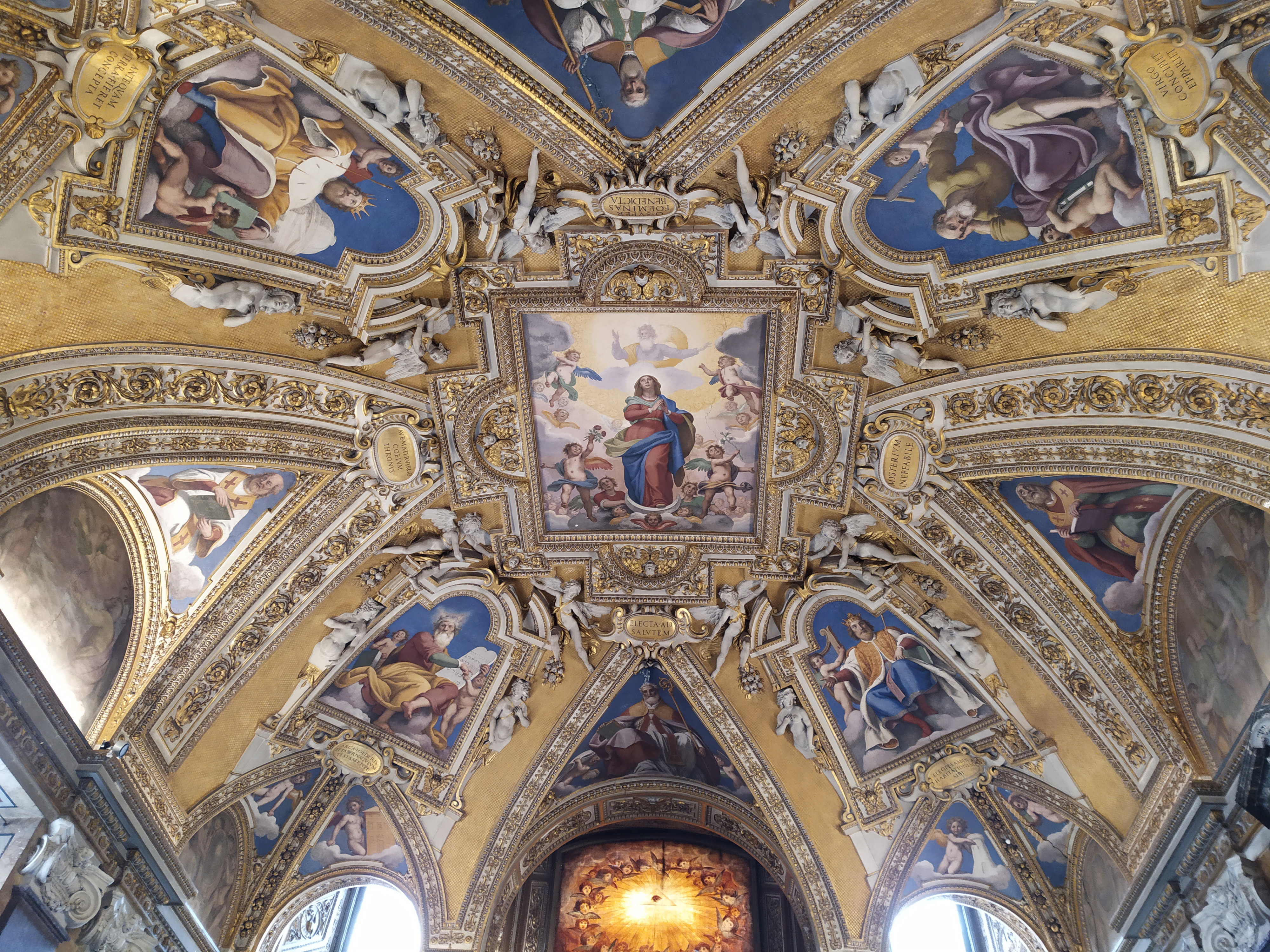 Фрески на сводах баптистерия, созданные флорентийским художником Доменико Пассиньяно, посвящены непорочному зачатию Девы Марии. Не путать с непорочным зачатием Иисуса – эти два понятия имеют совершенно разное значение. Непорочное зачатие Иисуса Христа означает то, что Мария зачала Иисуса от Святого Духа, сохранив при этом свое девство. Под непорочным зачатием Девы Марии подразумевается католическое учение, согласно которому Мария была зачата родителями традиционным образом, но не унаследовала первородный грех. Таков догмат в католицизме, который был провозглашен в 1854 году папой Пием IX. На фреске свода при входе в баптистерий представлена группа из пяти херувимов, исполняющая псалом: «Радуйся, Мария, избранная еще до рождения Бога, предсказанного сладостным благовещеньем».