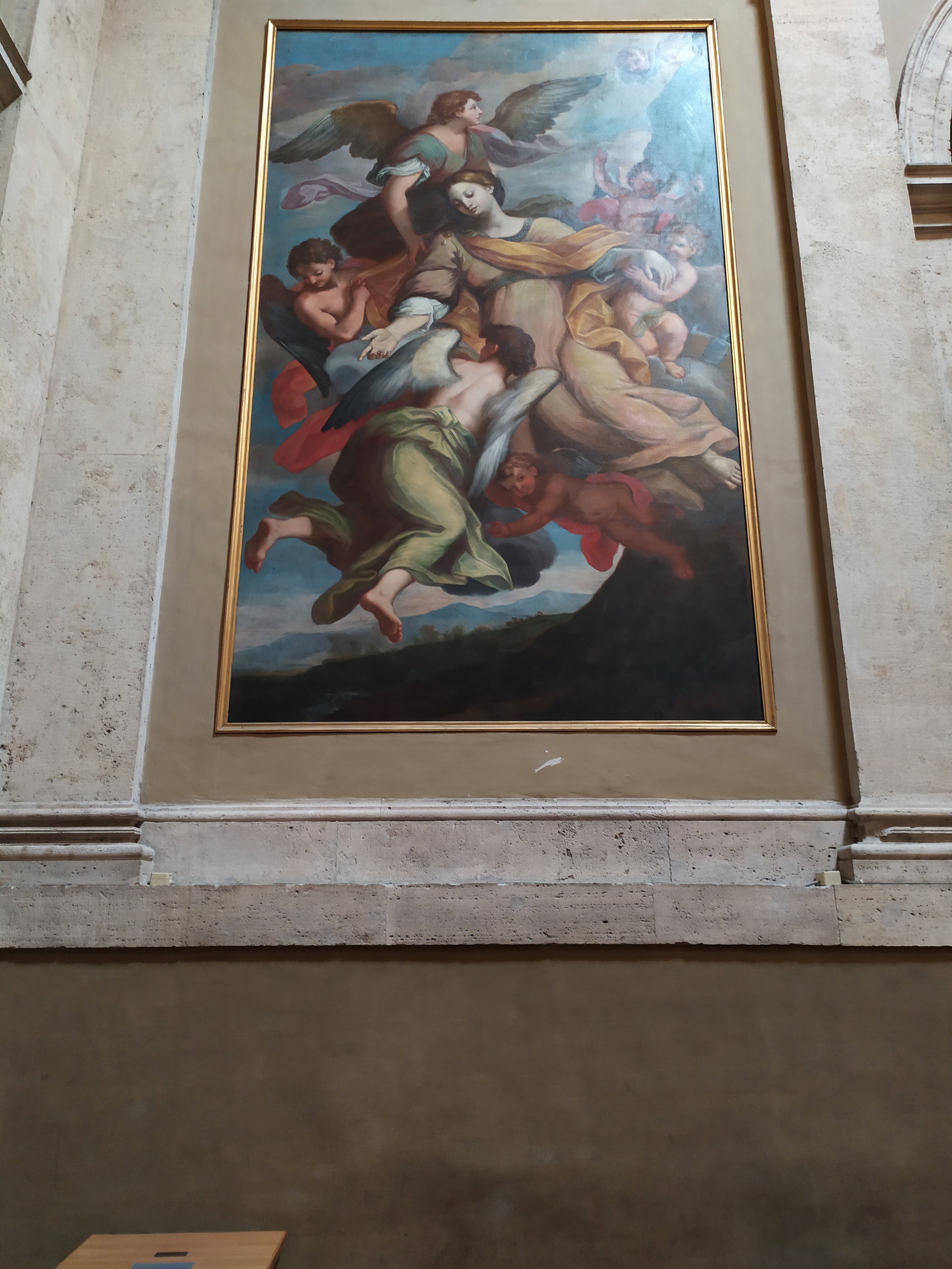 Жизнь и принятие мученичества святой Екатерины отражены в прекрасных настенных фресках, созданных в 1568 году римским художником Джироламо Сичоланте да Сермонета. По преданию, Екатерина «изучила творения всех языческих писателей, древних стихотворцев и философов, хорошо знала сочинения мудрецов древности, а также сочинения знаменитейших врачей, как например, Асклепия, Гиппократа и Галена». Своим родителям она объявила, что выйдет замуж лишь за того, кто превзойдет ее по всем этим качествам. Однажды случилось видение, будто она перенеслась на небеса к Деве Марии, где младенец Иисус подарил ей кольцо и назвал ее своей невестой. Именно этот эпизод из видения Екатерины изображен на фреске.