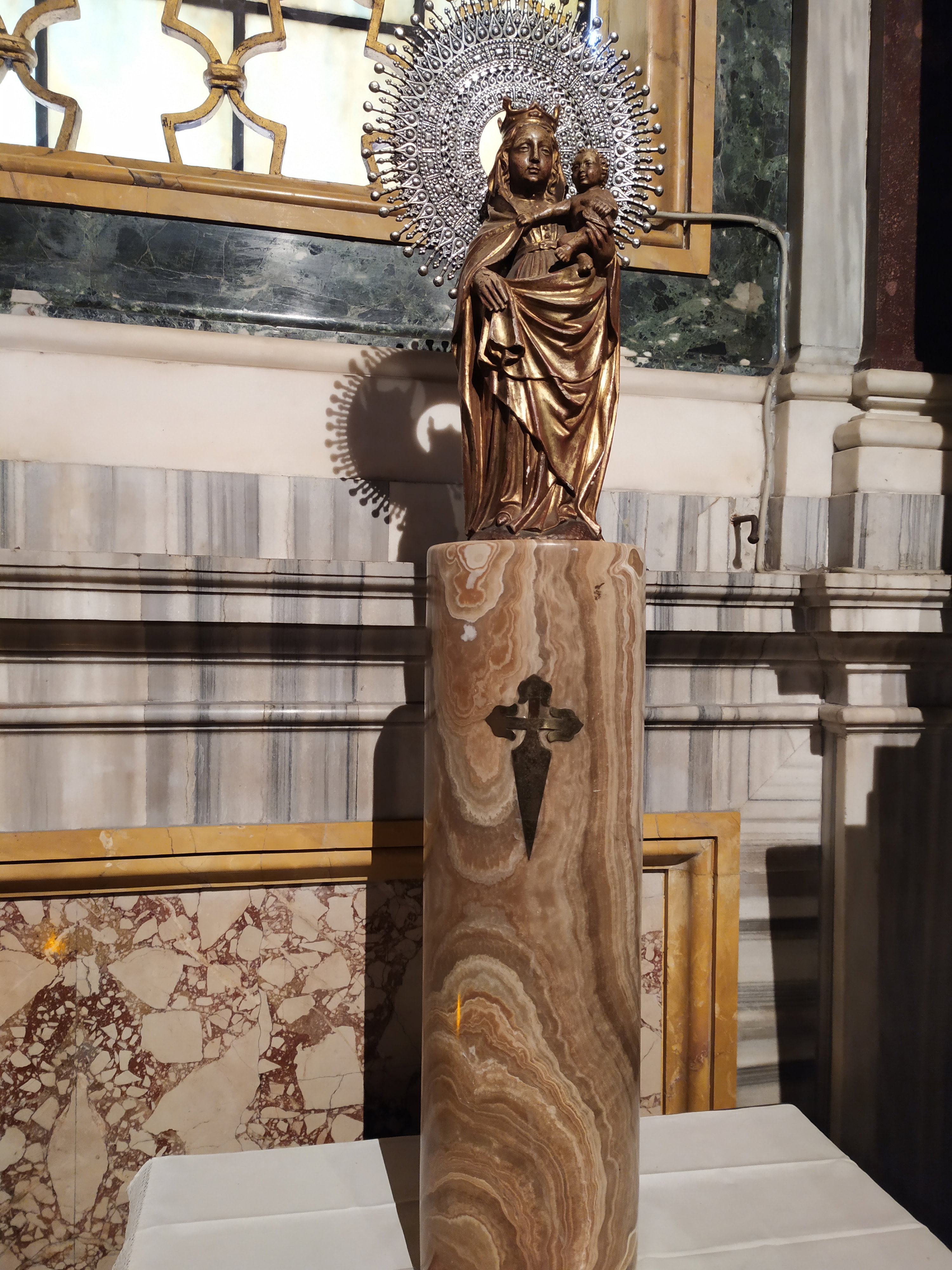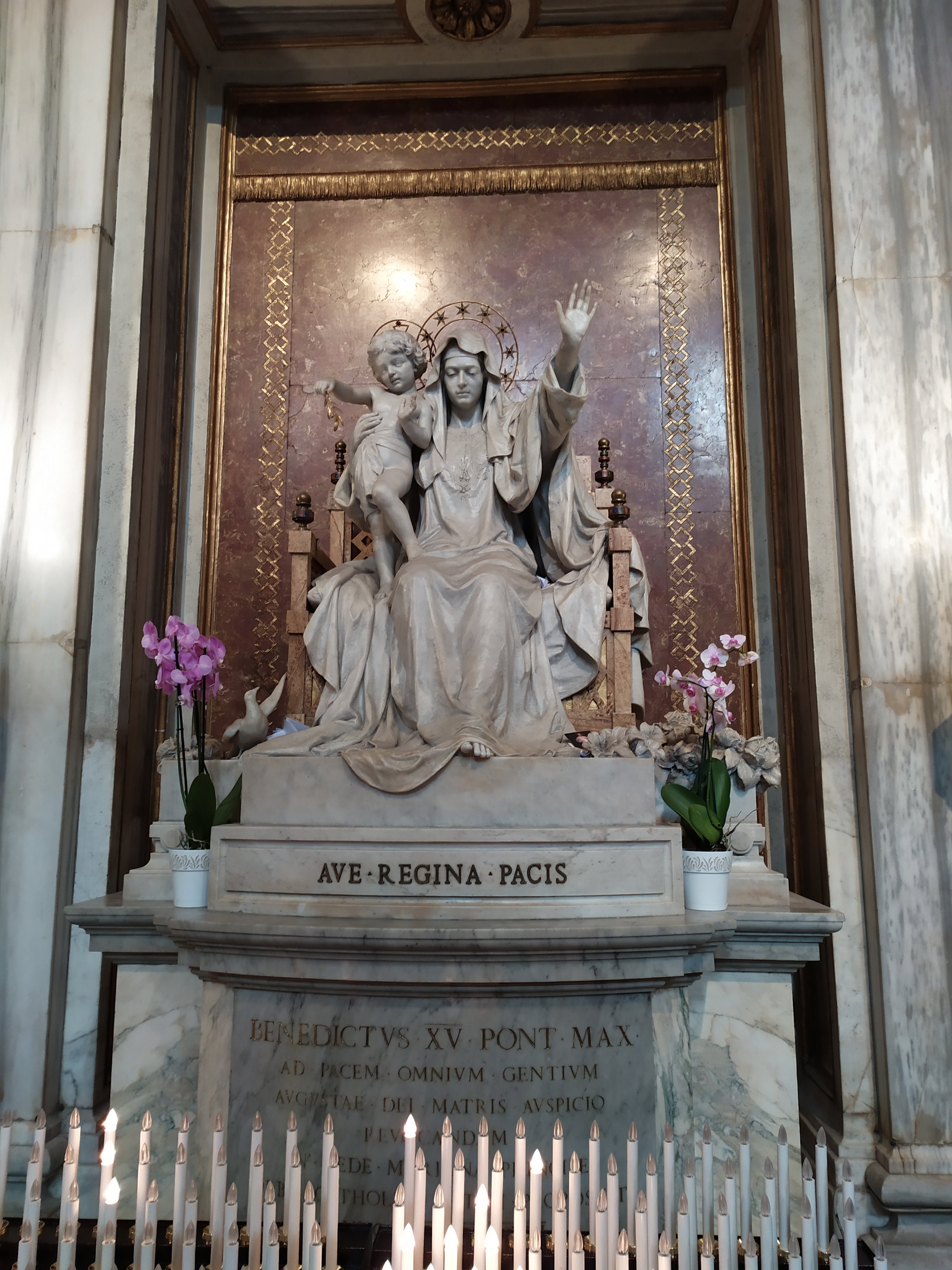 Скульптура Девы Марии с надписью «Ave Regina Pacis» («Славься, Королева Мира»), созданная Гвидо Галли в 1918 году по заказу папы Бенедикта XV, посвящена погибшим в Первую мировую войну. Дева Мария изображена с поднятой вверх рукой, как бы говоря всем: «Хватит! Никогда больше войны!». Именно война и ее последствия стали основным направлением деятельности Бенедикта XV в годы его понтификата. Считая войну «самоубийством цивилизованной Европы», он объявил нейтралитет Святого Престола и предложил посреднические услуги при заключении мира. Но воющие стороны отвергли предложение «Папского мира», посчитав его оскорблением в свой адрес. Печальный взгляд Девы Марии говорит о глубокой печали из-за жестокой бойни, которая столько лет проливала кровь в Европе.