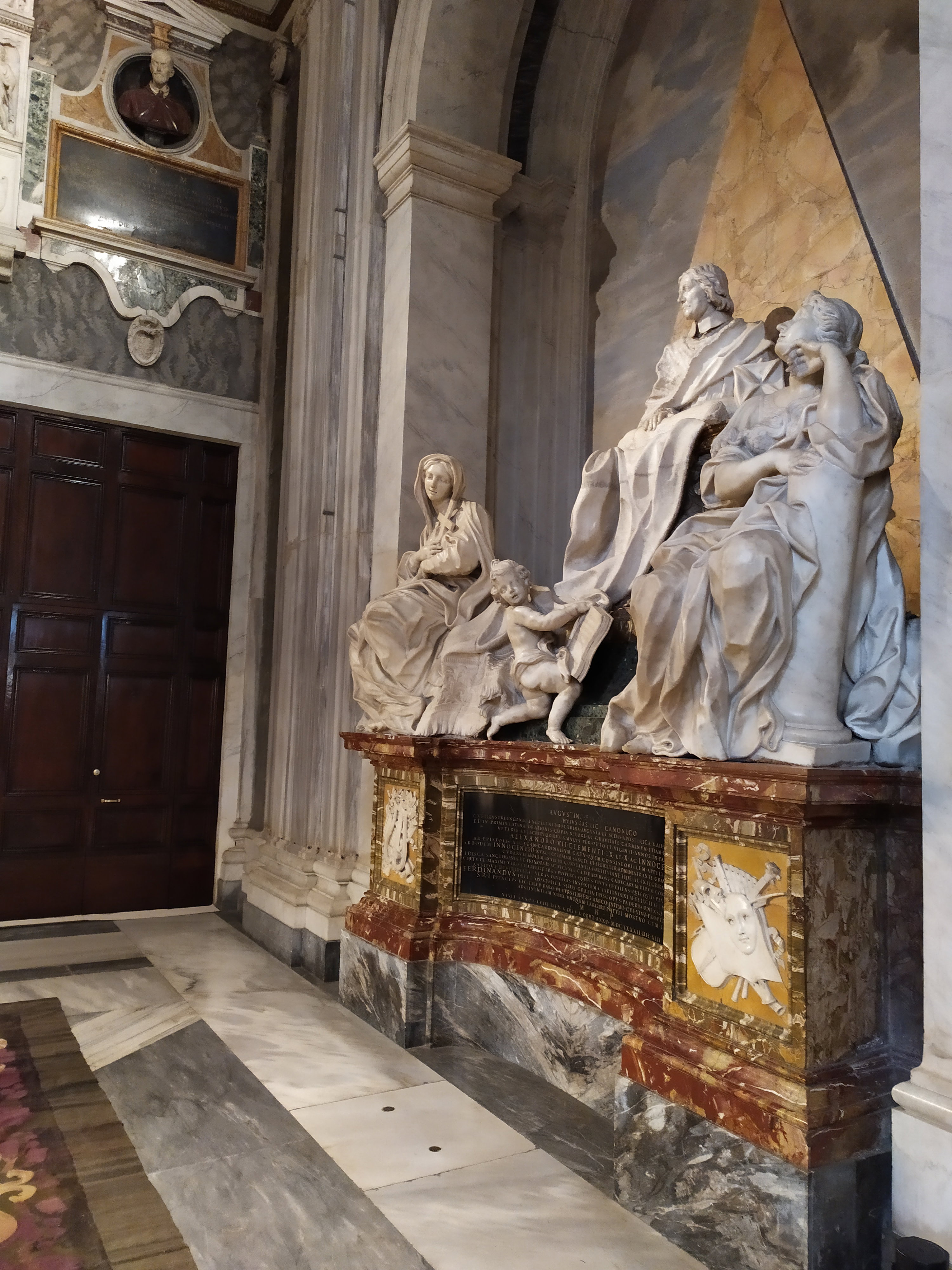 Монументальный сценографический памятник посвящен Агостино Фаворити, канонику базилики Санта-Мария-Маджоре, юристу и литератору. Более 20 лет он был ключевой фигурой в папской политике и дипломатии Ватикана. Его дипломатические услуги оценивались должным образом, а после захоронения в базилике Санта-Мария-Маджоре ему был воздвигнут роскошный памятник, достойный папы римского. Эскизы памятника создал римский художник Лудовико Джиминьяни, ученик Джованни Лоренцо Бернини. Видимо, поэтому скульптурная группа выглядит театрально. Драматические позы и выразительные жесты скульптур создают ощущение движения, как будто это сцена из спектакля. Женские фигуры символизируют религиозность и мужество Фаворити, а путти с книгой – его ученость, знания и мудрость.