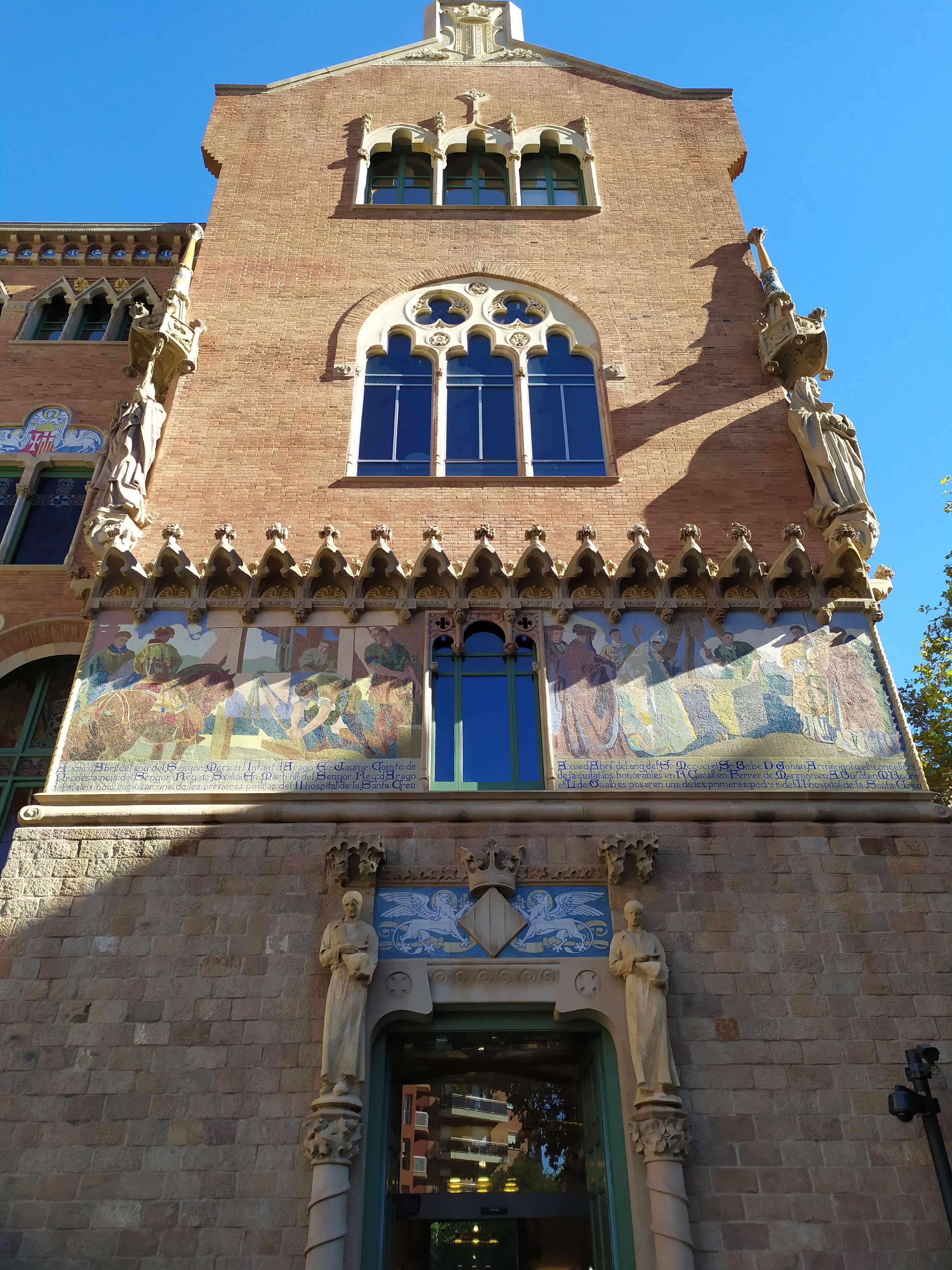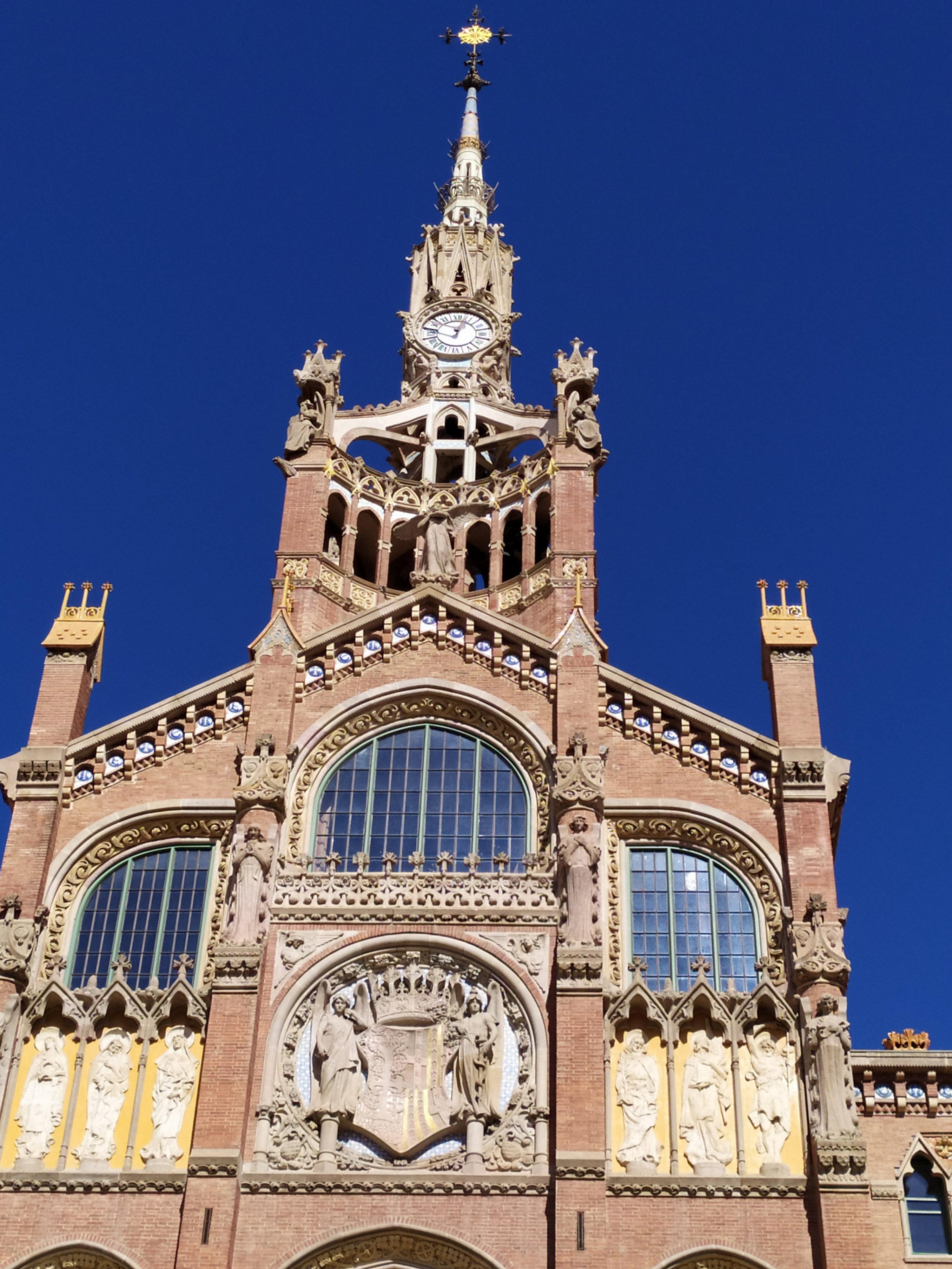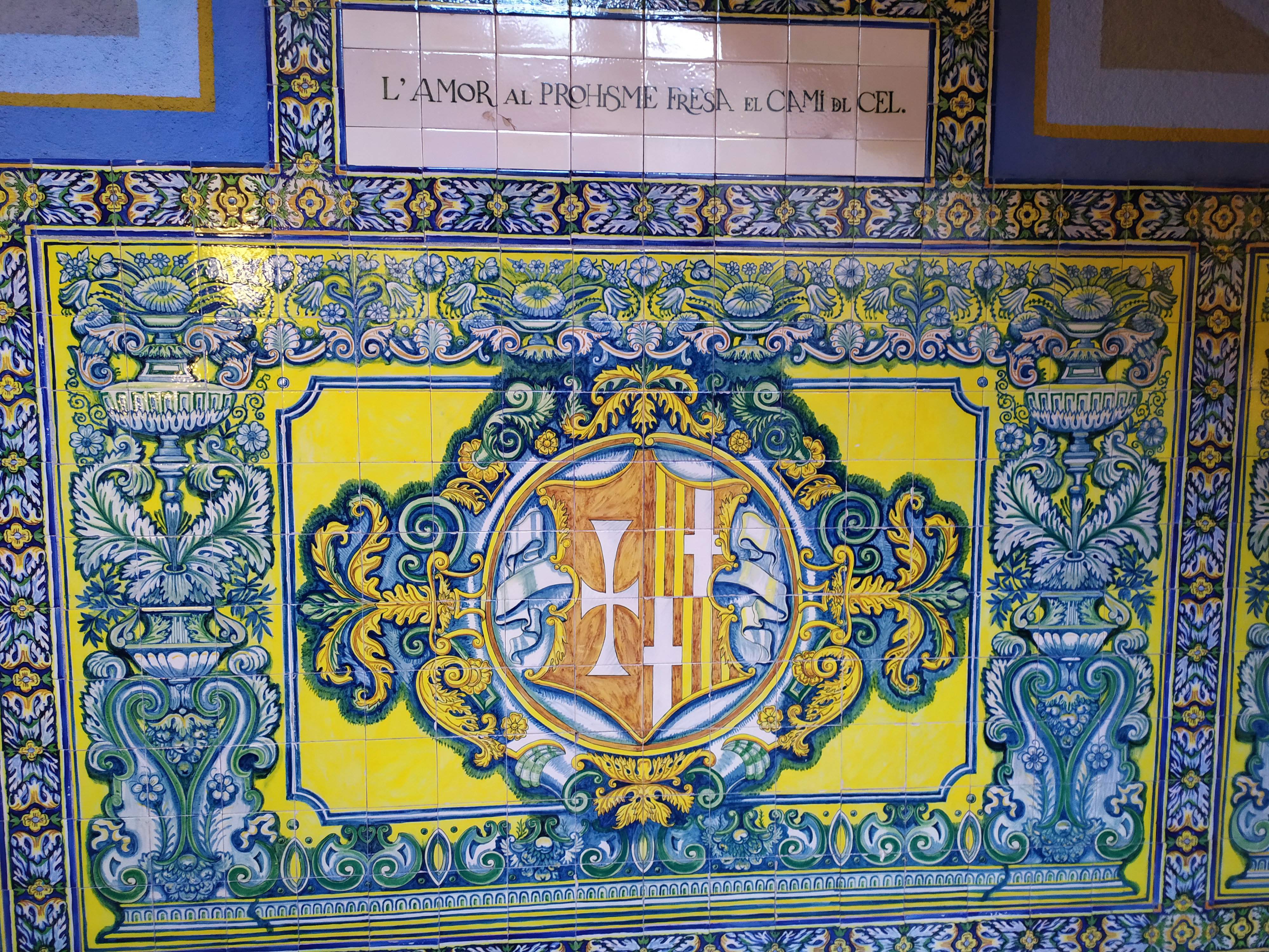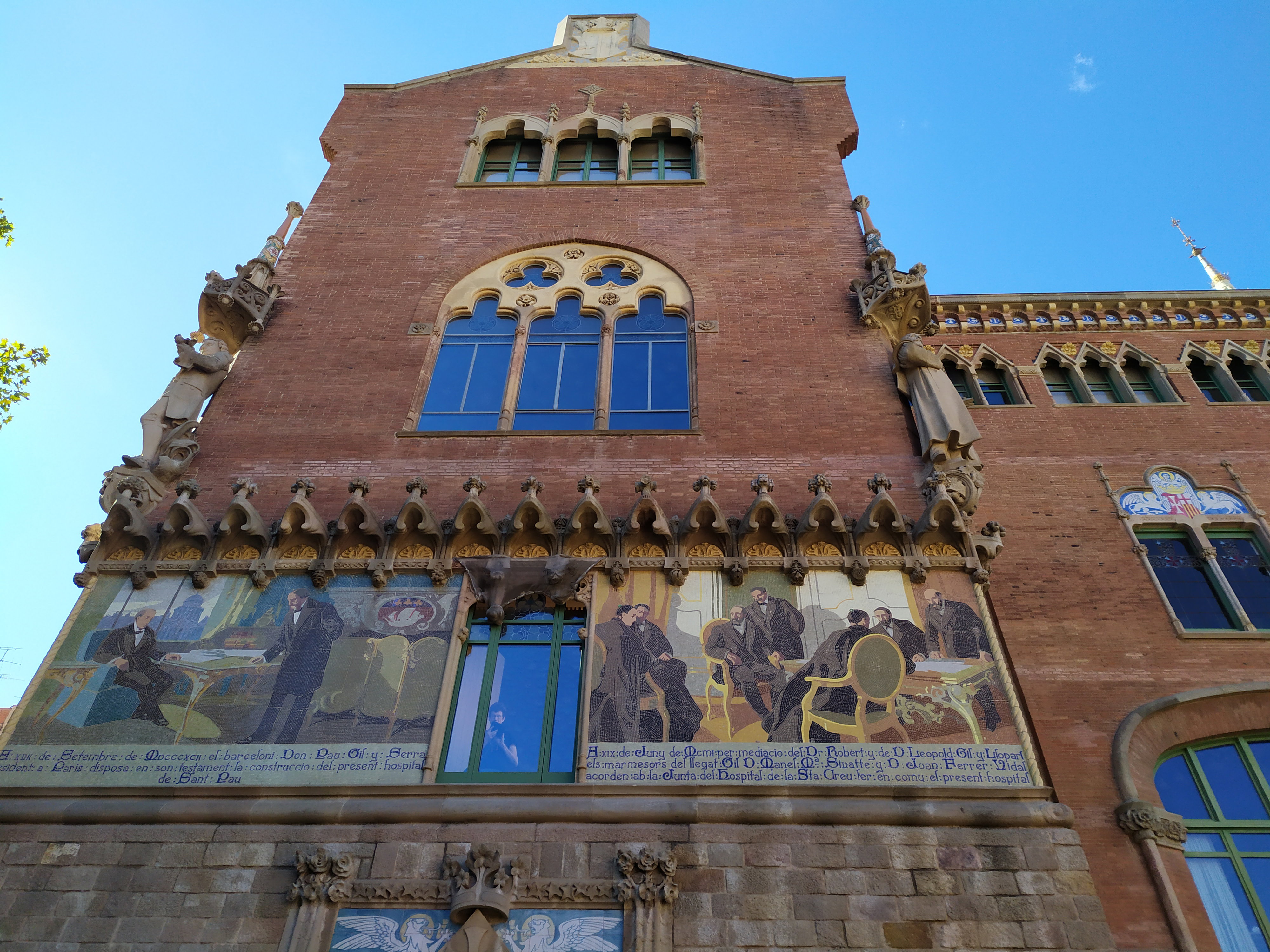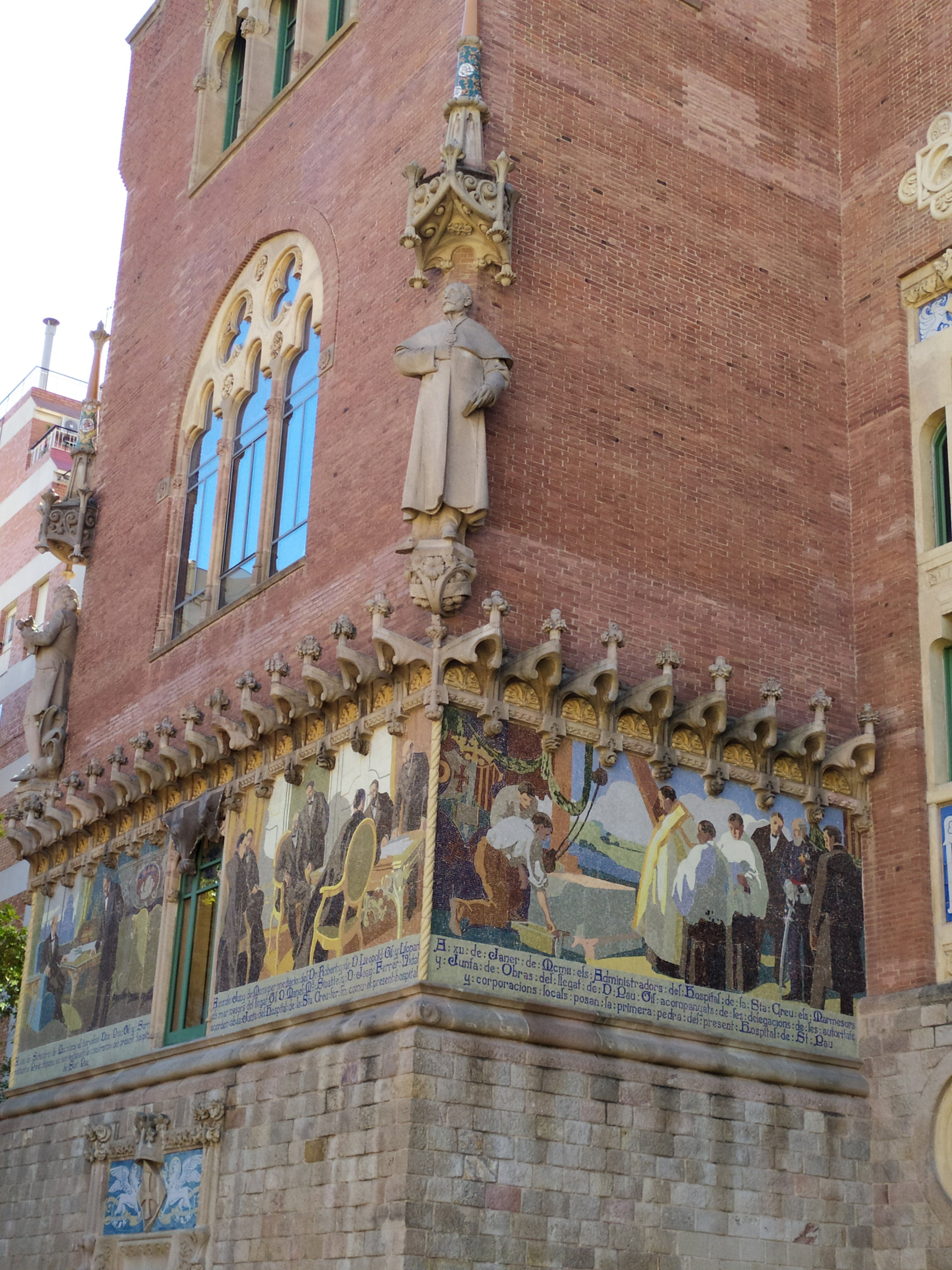 Как видите, каталонский модернизм представлен во всей красе. Не только каждая фигурка, но и каждая мозаика несет определенный смысл. Мозаичные росписи на фасаде административного здания повествуют об исторических событиях госпиталя, начиная с основания в 9 веке первой больницы Святого Креста в центре старой Барселоны. Несколько мозаик представляют историю 1892 года, когда банкир и меценат Пау-Хиль-и-Серра оформлял в Париже завещание, в котором распорядился, чтобы его похоронили в Барселоне, рядом с родителями, а средства, полученные в результате ликвидации банка, использовали на строительство больницы для бедных людей.