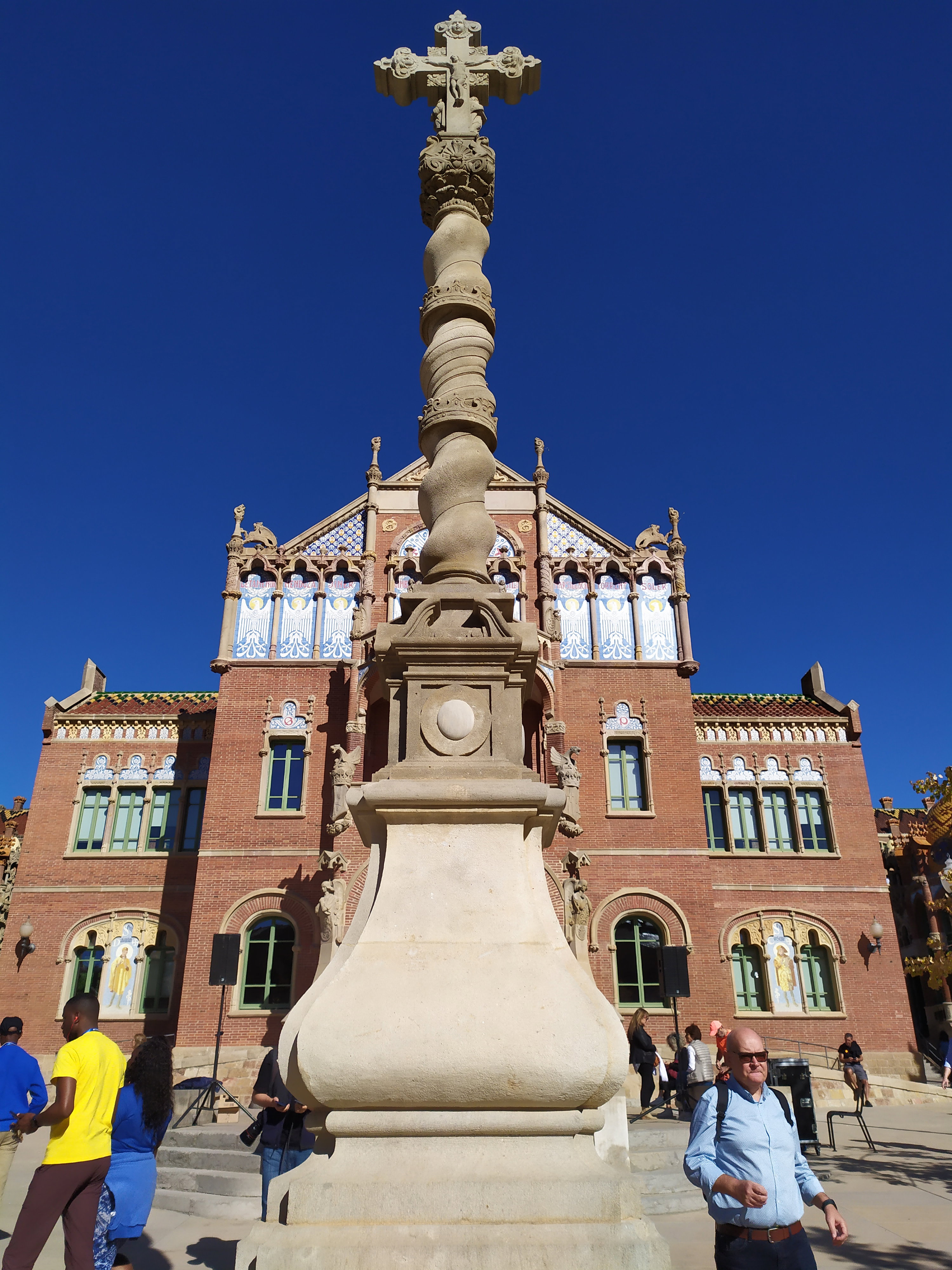 Монументальный крест, установленный в центре площади, символизирует связь госпиталя Сан-Пау со средневековым госпиталем Святого Креста. Известно, что одним из последних пациентов этого госпиталя был Антонио Гауди, известнейший архитектор 20 века, автор уникального храма Святого Семейства («Sagrada Familia»). 73-летнего Антонио Гауди сбил трамвай. При этом он был так плохо одет, что его отвезли в госпиталь Святого Креста для бедных. Когда в госпитале узнали знаменитого архитектора, то предложили ему другую клинику, на что Гауди гордо ответил: «Мое место здесь, среди бедных» и умер три дня спустя. Вскоре госпиталь Святого Креста был закрыт.