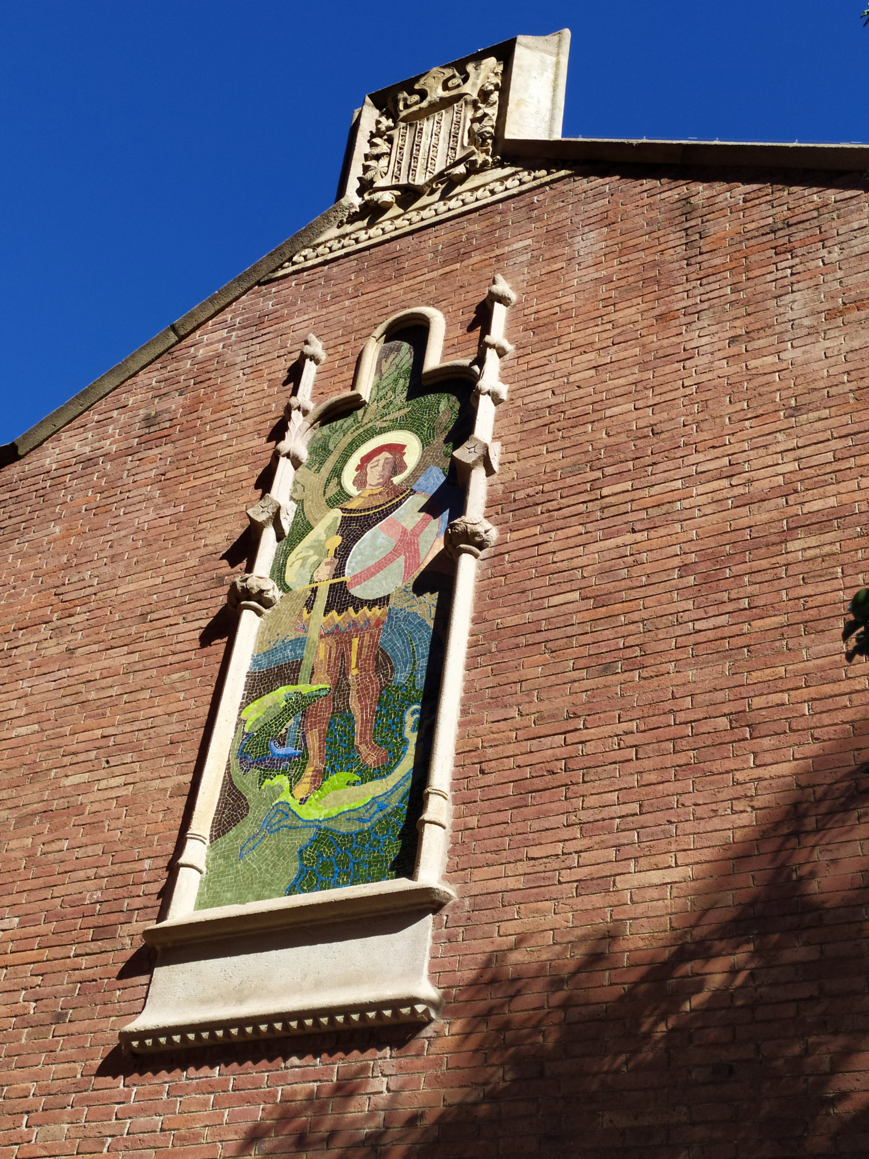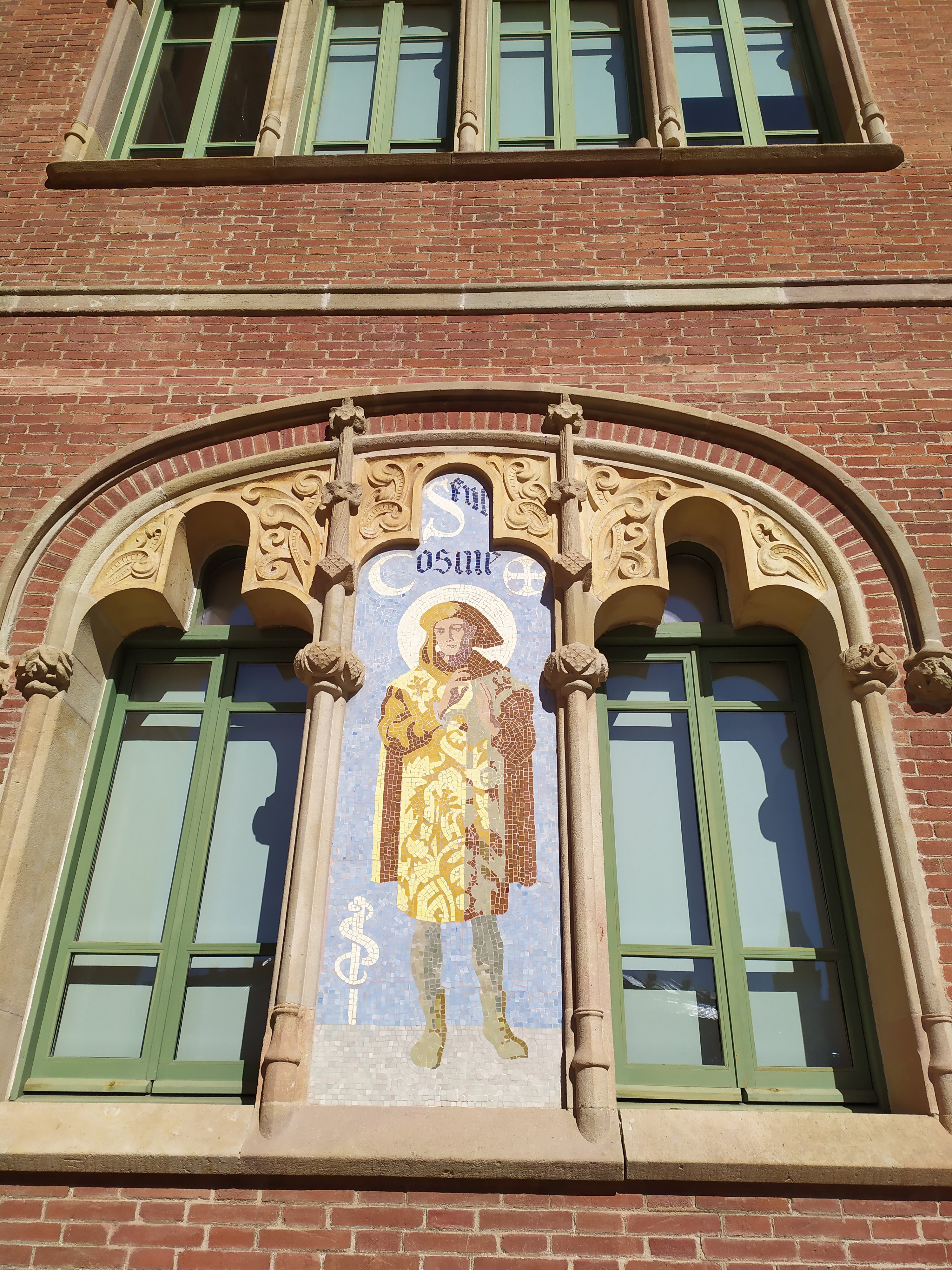 Два идентичных здания, расположенных по обеим сторонам от входа на территорию госпиталя, предназначались для диагностики поступающих пациентов. Их различие лишь в том, что корпус, украшенный фреской с изображением Сан-Жорди (святого Георгия, покровителя Каталонии) был мужским, а корпус с изображением мученицы Аполлонии Александрийской, покровительницы стоматологии, – женским. Существует даже поверье, что стоит произнести: «Santa Apollonia!», как зубная боль отступит. Праздник Сан-Жорди, отмечаемый каталонцами ежегодно 23 апреля, напоминает известный во всем мире День святого Валентина, но в Каталонии он приобрел свои особенные традиции. История возникновения праздника связана с красивой легендой, которая начиналась в далеком 4 веке, когда воин Сан-Жорди спас принцессу от злого дракона, поразив его своим копьем. На месте, где была пролита кровь дракона, выросли розы. Самую красивую розу воин подарил принцессе. С тех пор 23 апреля считается днем почитания святого Георгия во всех христианских церквях. У каталонцев этот день называется праздником Сан-Жорди. В этот теплый весенний день мужчины дарят своим возлюбленным розы, а женщины им в ответ – книги. Традиция дарить книги связана с памятью о великом испанском писателе Мигеле де Сервантесе, который умер 23 апреля 1616 года.