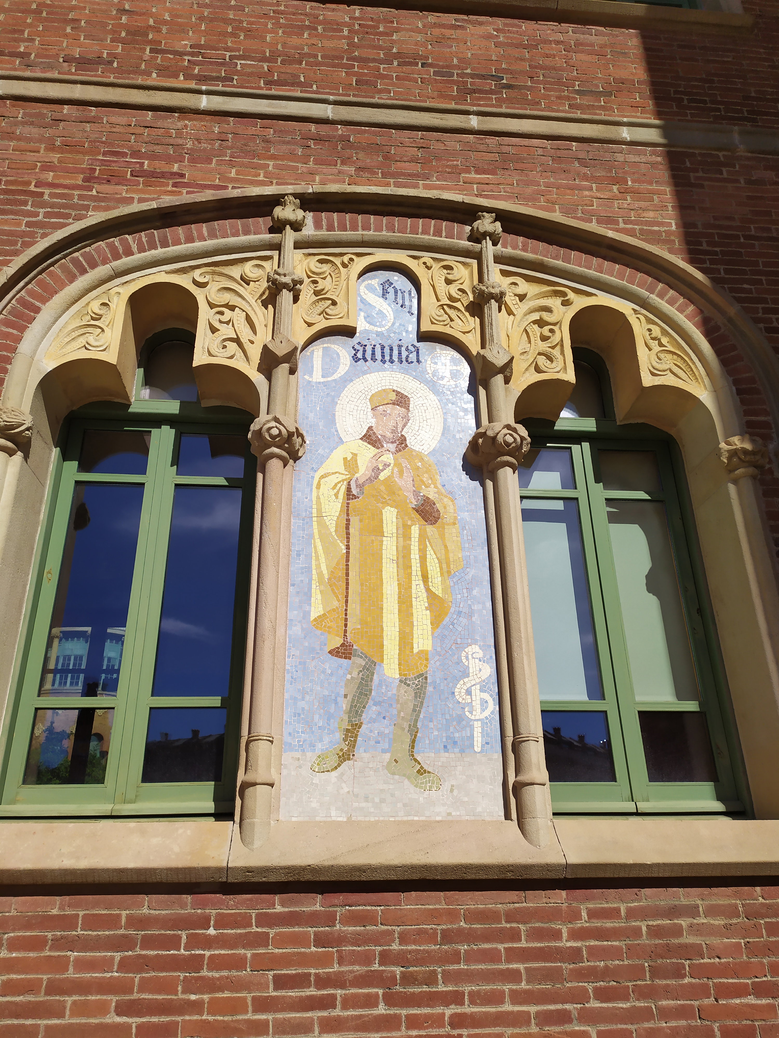 Некоторые мозаики посвящены торжественной церемонии, состоявшейся 15 января 1902 года, в честь закладки первого камня на месте будущего строительства госпиталя Сан-Пау. В результате спустя 28 лет появился впечатляющий архитектурный комплекс, в котором как в сказке выросли совершенно невероятные краснокирпичные здания. Даже строительный материал был выбран не случайно. Это у нас краснокирпичный цвет ассоциируется с пролетарским духом (помните наши заводы и фабрики, созданные в стиле «Красного Октября»?), а в Испании он символизирует силу духа (неслучайно ведь испанские арены для боя быков тоже построены из красного кирпича).
