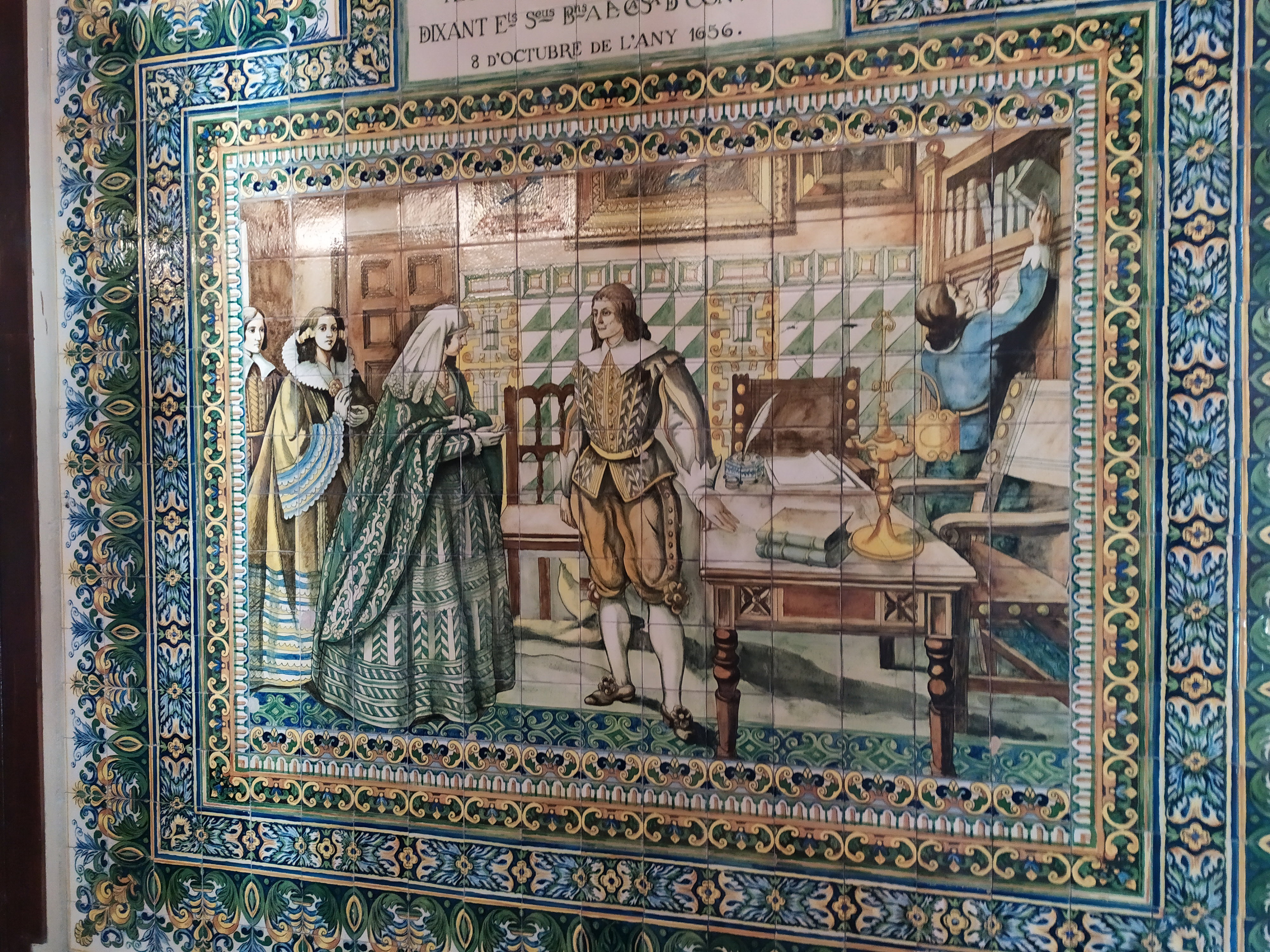 Некоторые керамическое панно посвящены строительству в 1401 году и реконструкции госпиталя Святого Креста для бедных. На одном из панно представлено историческое событие, датируемое 8 октября 1656 года, связанное с описью имущества купца из Барселоны. Согласно завещанию доход от наследства могла получить его дочь, но при условии, что часть средств будет потрачена на содержание госпиталя Святого Креста.