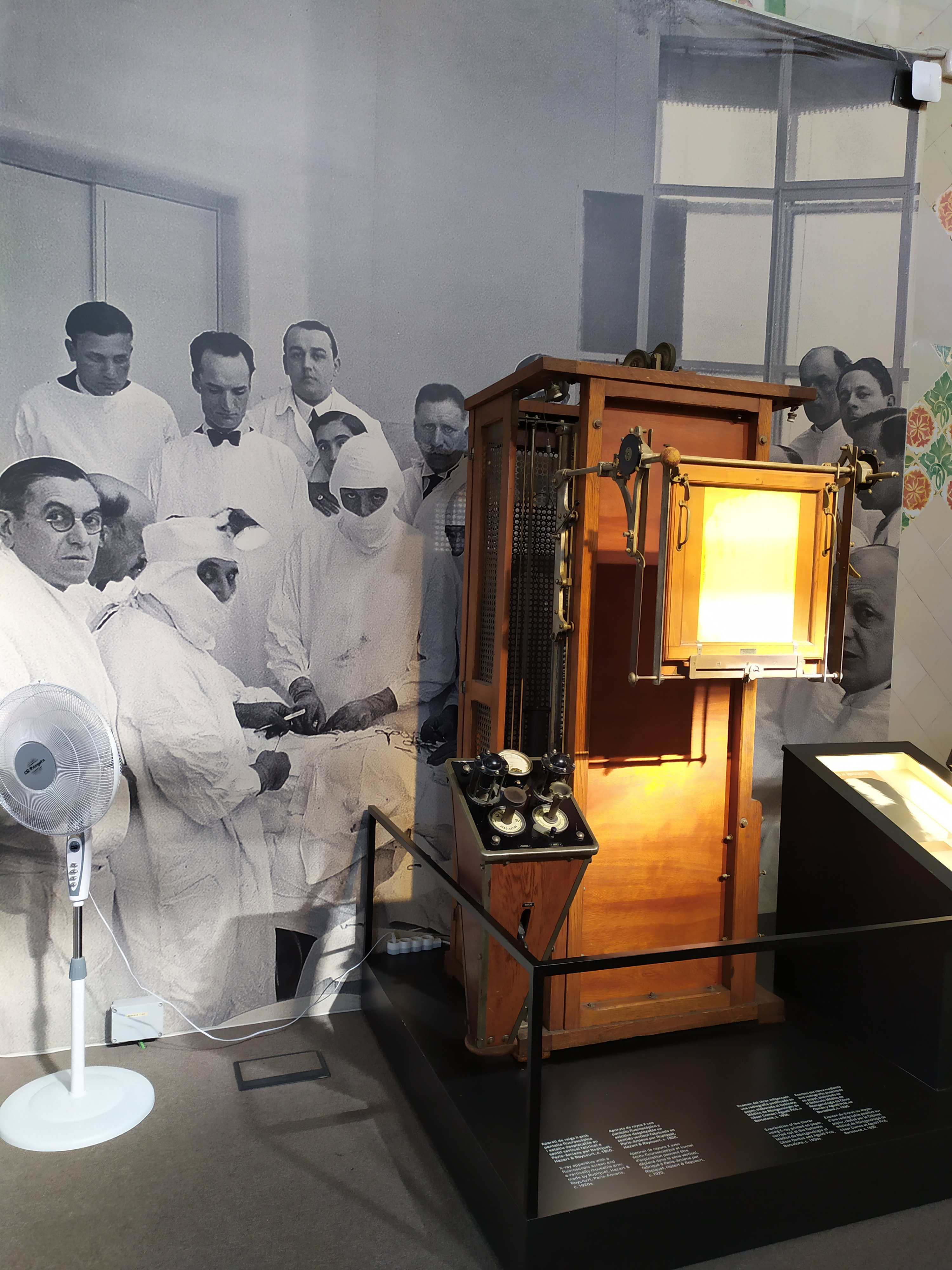 Демонстрация некоторых экспонатов сопровождается изображениями, которые проецируются на стену так, что создается эффект присутствия в одной комнате с вами врачей и пациентов из разного времени. Представленный рентгеновский аппарат связан с открытием немецкого физика Вильгельма Конрада Рентгена. В 1895 году, проводя эксперименты в своей лаборатории, ученый заметил, что катодные лучи, обладая свойством проходить сквозь разные материалы, включая ткани человеческого тела, создавали тень на фотопластинке. Так, в Германии был создан первый рентгеновский аппарат. Выглядел он громоздко и примитивно, но именно он позволил впервые в истории взглянуть внутрь человеческого тела без проведения хирургических операций.