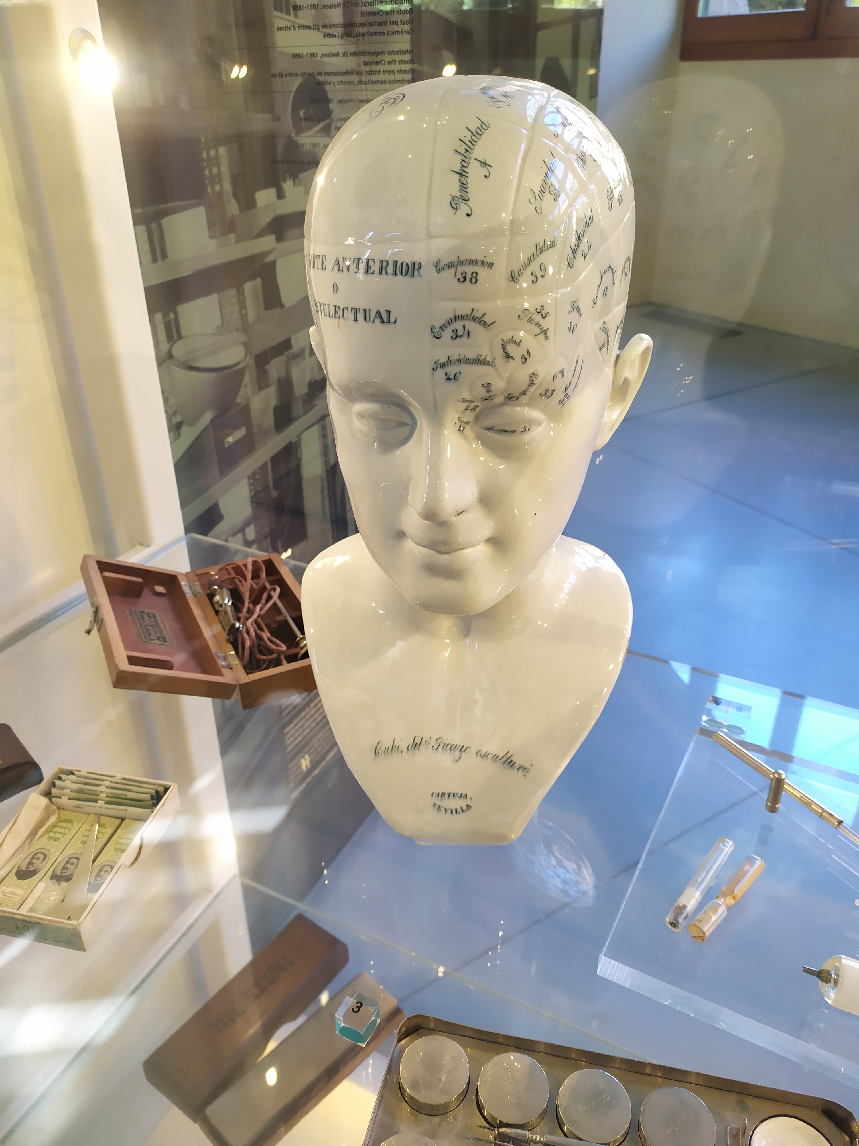 В экспозиции привлекает внимание френологическая голова – наглядное пособие, используемое во френологии, псевдонаучной теории, которая утверждает, что черты характера и умственные способности человека можно определить по форме и строению черепа. Основатель френологии, австрийский врач Франц Йозеф Галль, утверждал, что все психические свойства локализуются в различных участках мозга, и полагал, что различия в мозговых извилинах можно определить по выпуклости («шишке») на соответствующем участке черепа, а при недоразвитии части мозга – по впадине. Шерлок Холмс, герой детективных романов Артура Конан Дойла, разделял убеждение френологов, считая, что чем больше объем черепа человека, тем больше размер его мозга и тем выше его умственные способности. Это положение френологии было опровергнуто после того, как в результате исследования мозга известных интеллектуалов, таких как Альберт Эйнштейн, было установлено, что их мозг не отличался большими размерами. Развитие нейрофизиологии окончательно установило несостоятельность теории Франца Йозефа Галля.