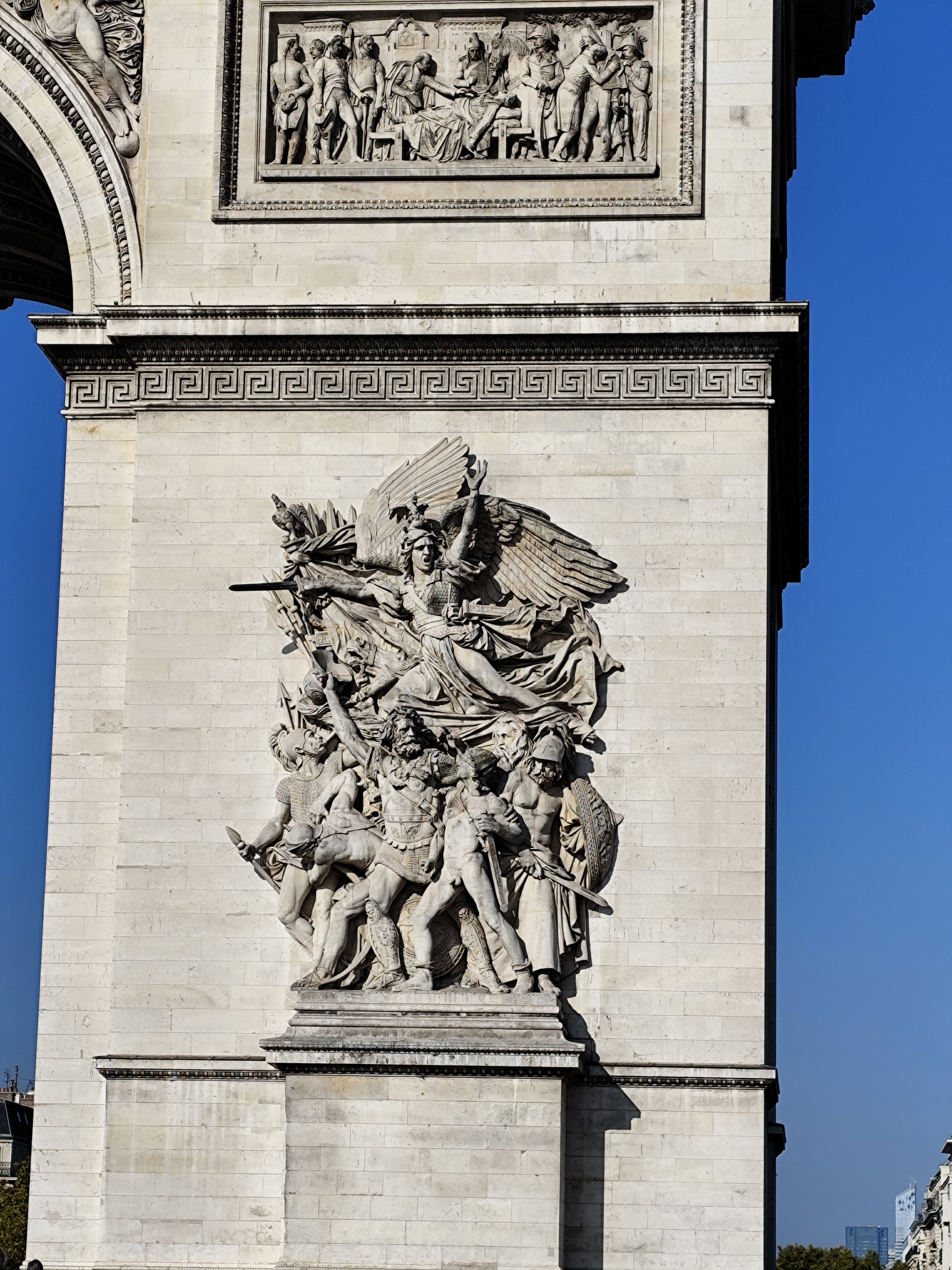 Барельеф «Выступление добровольцев 1792 года» посвящен Марсельскому добровольческому батальону, который вошел в Париж для защиты завоевания Великой Французской революции от европейских монархических режимов во главе с Австрией. Добровольцы в качестве походной песни исполняли «Марш войны», который вошел в историю под названием «Марсельеза». После волны революций 1848 года, которая прокатилась по всей Европе, «Марсельеза» стала гимном революционеров во всем мире, олицетворяя собой стремление к свободе и борьбу с тиранией. Сегодня она является государственным гимном Франции: «Сыны Отечества, вставайте, великий, славный день настал! Врагам на вызов отвечайте, их стан кровавый флаг поднял…».