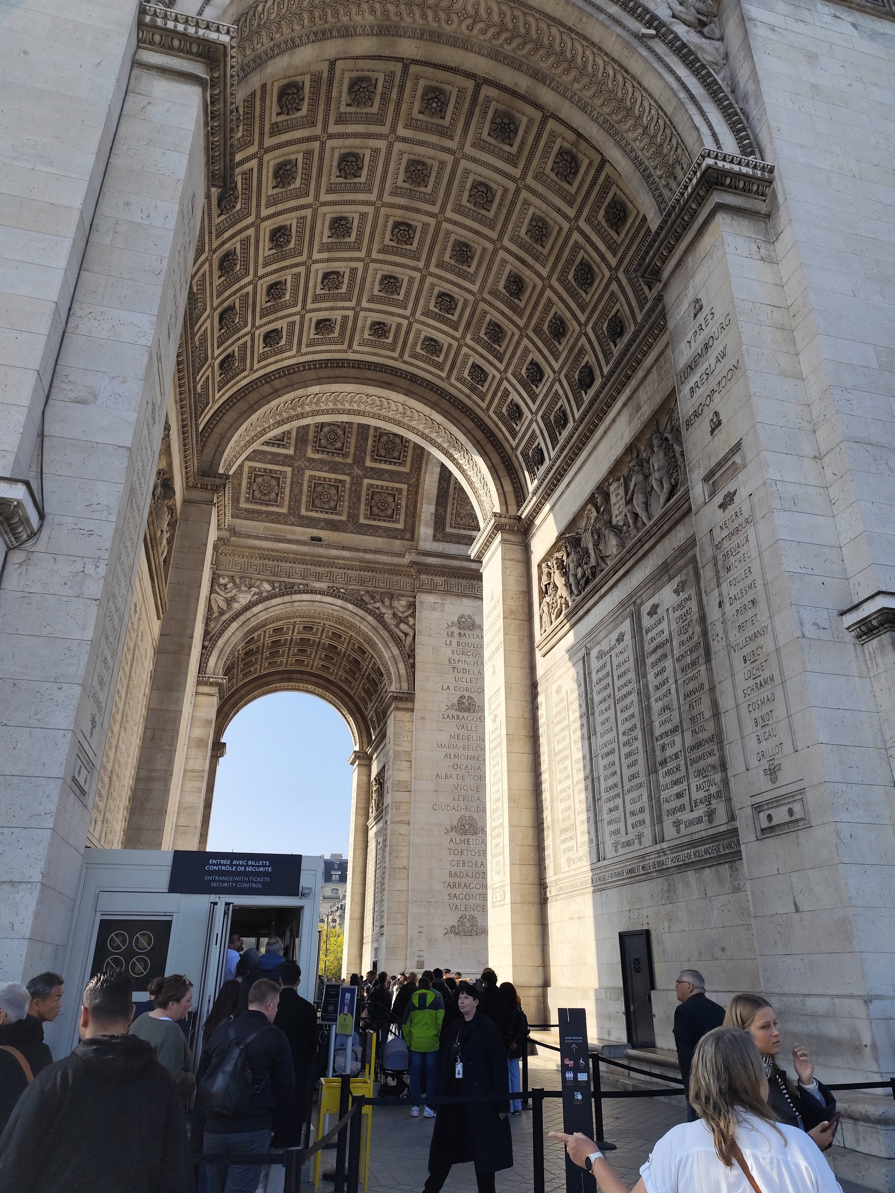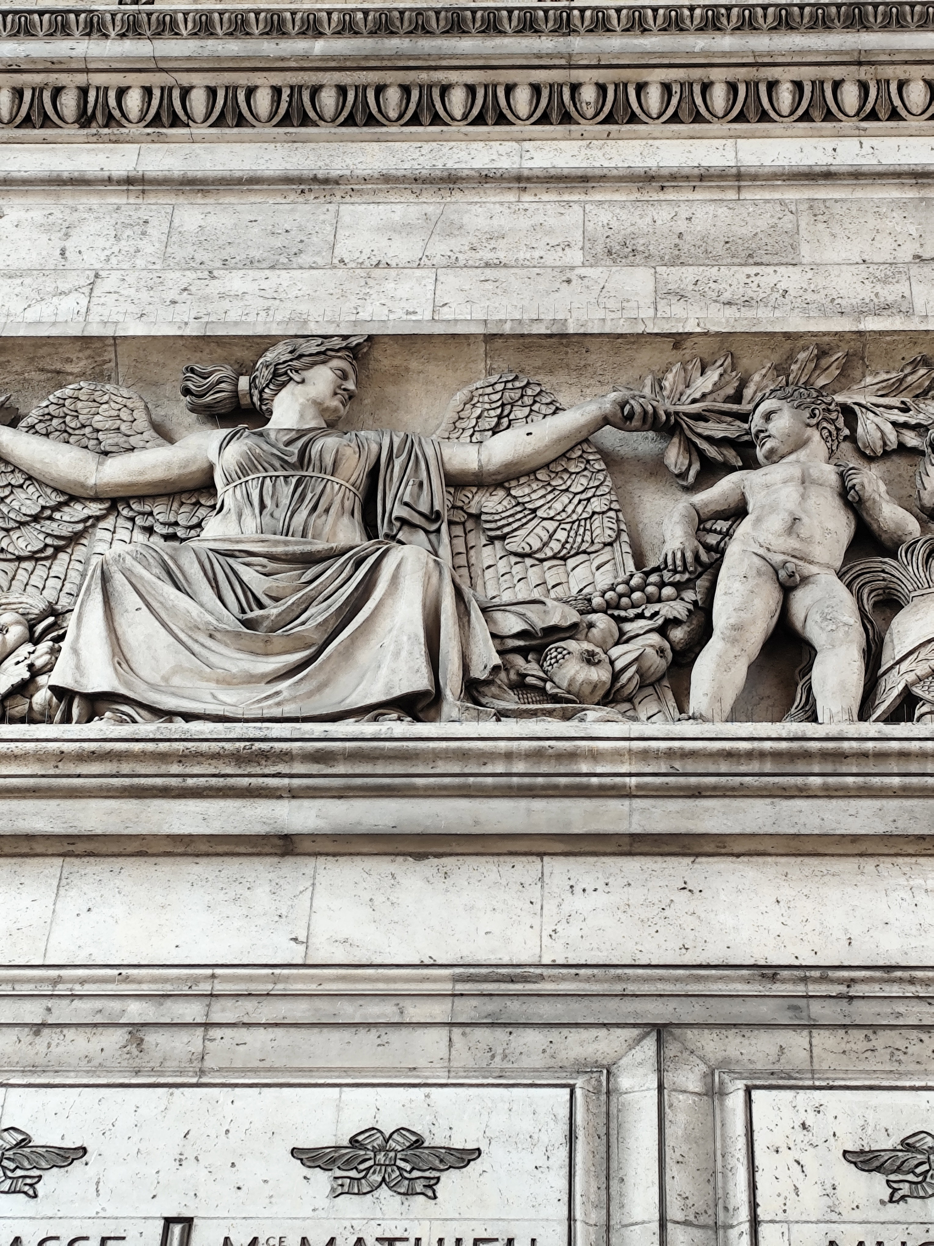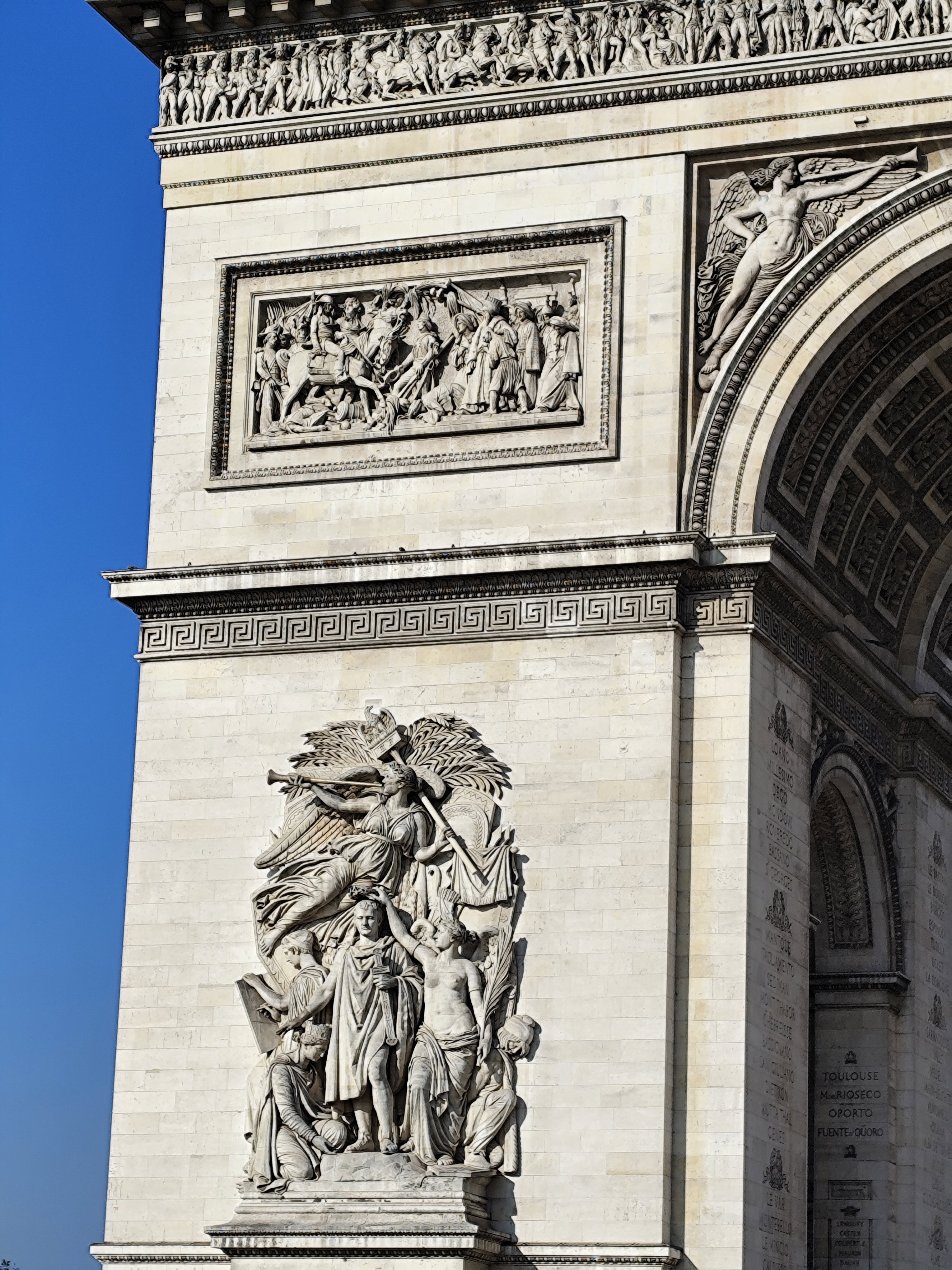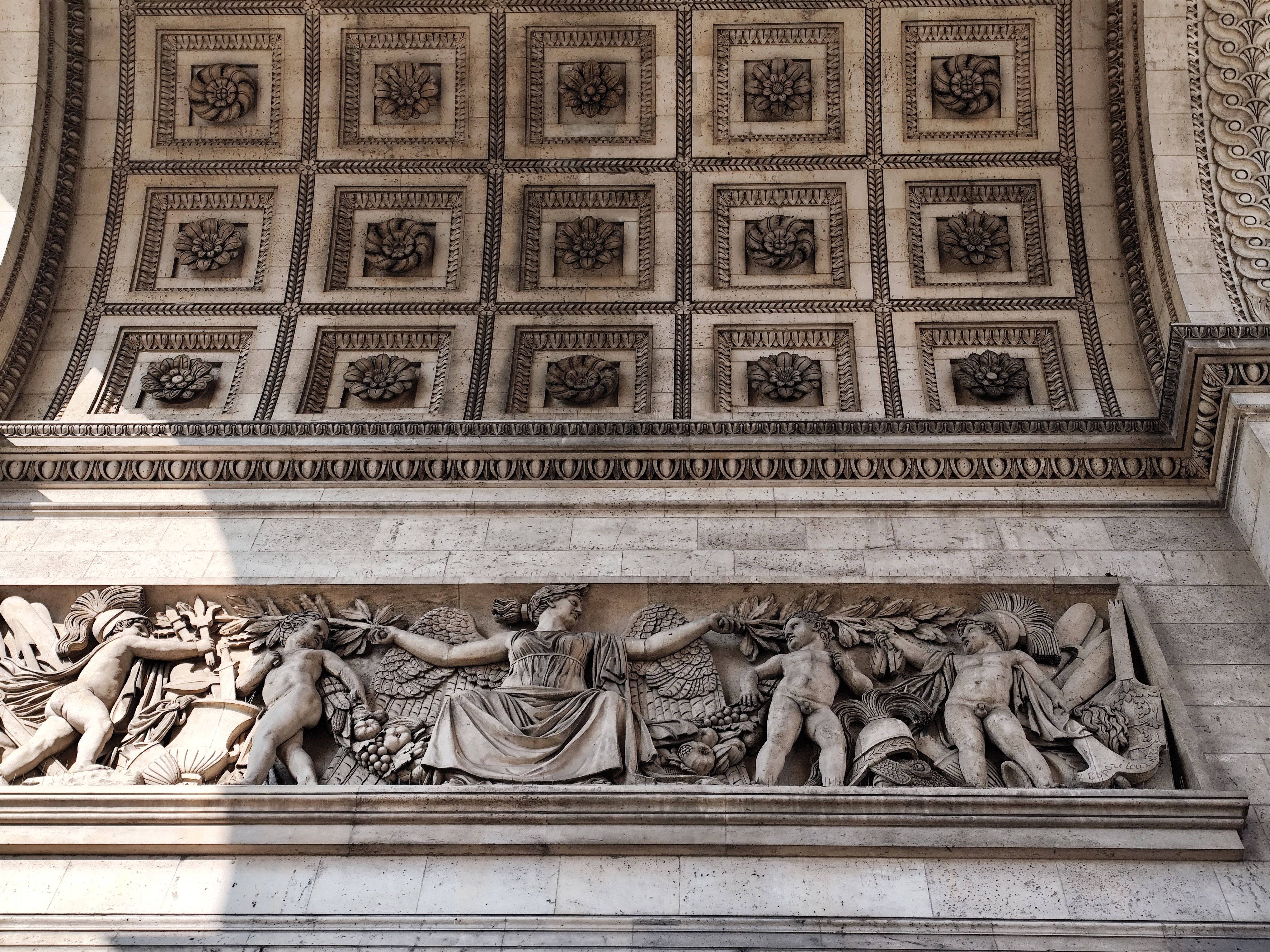 Триумфальная арка украшена барельефами, представляющими аллегорические композиции побед Наполеона (крылатые девы с фанфарами, триумфальные процессии). Изящество арочной конструкции подчеркивается кессонным потолком, панели которого создают сетчатый рисунок и добавляют потолочному пространству архитектурную элегантность.