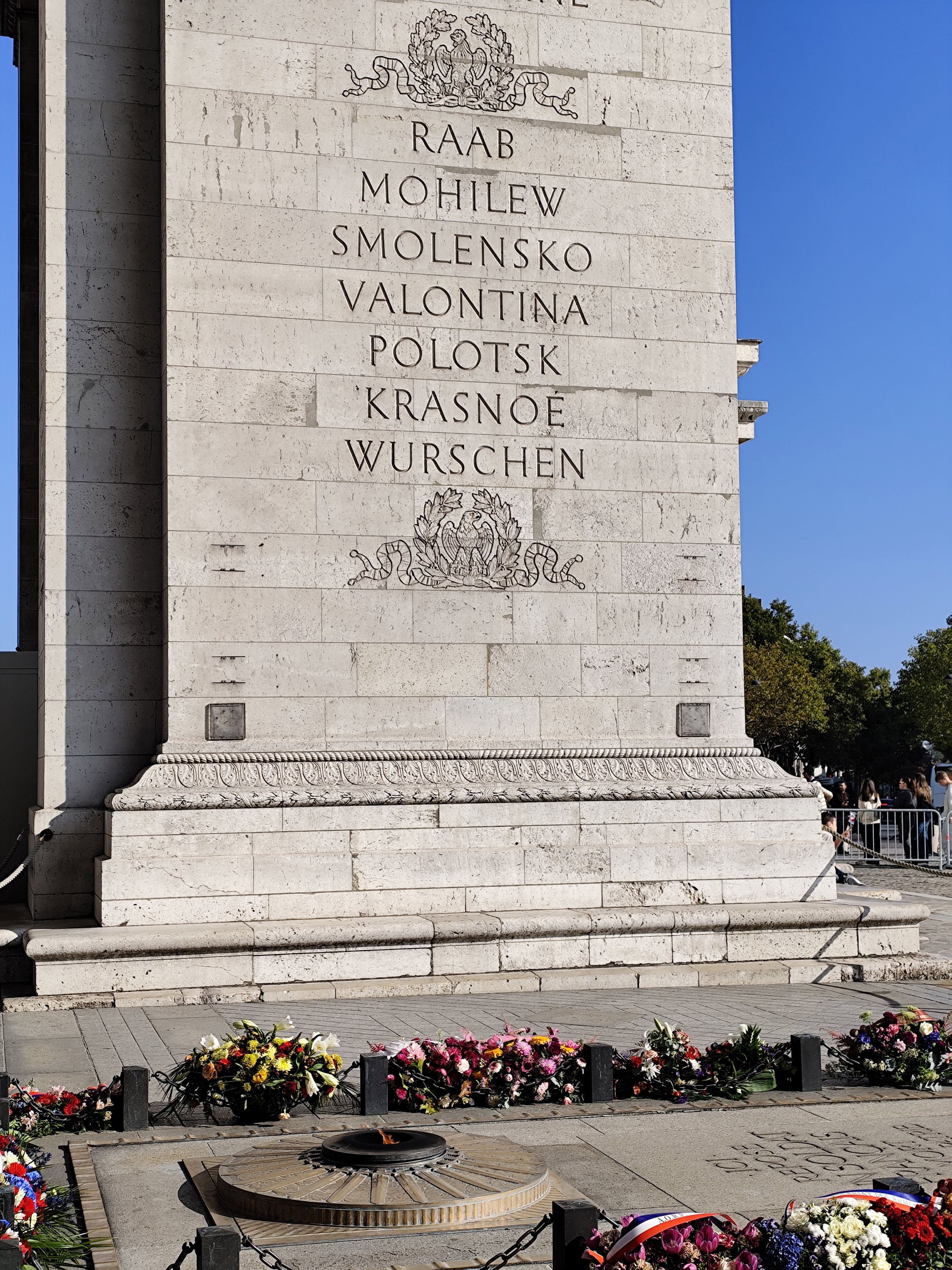 На одном из пилонов Триумфальной арки можно отыскать названия и наших городов – Могилев, Смоленск, Валутино, Полоцк, Красное. Бой под Могилевом состоялся в начале Отечественной войны 1812 года, после которого французы гордились тем, что они смогли сдержать напор армии Багратиона, а русские радовались тому, что армиям Багратиона и Барклая-де-Толли удалось объединиться в районе Смоленска. Одно из самых кровопролитных сражений в истории войны 1812 года произошло именно под Смоленском. Еще накануне боя, глядя в подзорную трубу на русские войска, Наполеон радовался: «Наконец я держу их в руках!». Однако после 2-х дневного сражения русская армия опять выскользнула из рук Наполеона. Оставив Смоленск, войска под командованием Барклая-де-Толли отступили к Москве. Сражение у Валутино французский штаб не рассматривал как успех, хотя формально русские оставили поселок, но сделали это так, как написал французский генерал Филипп-Поль де Сегюр: «В их поражении было столько же славы, сколько в нашей победе». Первый бой под Полоцком не имел серьезных последствий. Здесь был оставлен только один отряд генерала Витгенштейна для прикрытия дороги на Санкт-Петербург. Основные бои разворачивались в направлении Москвы.