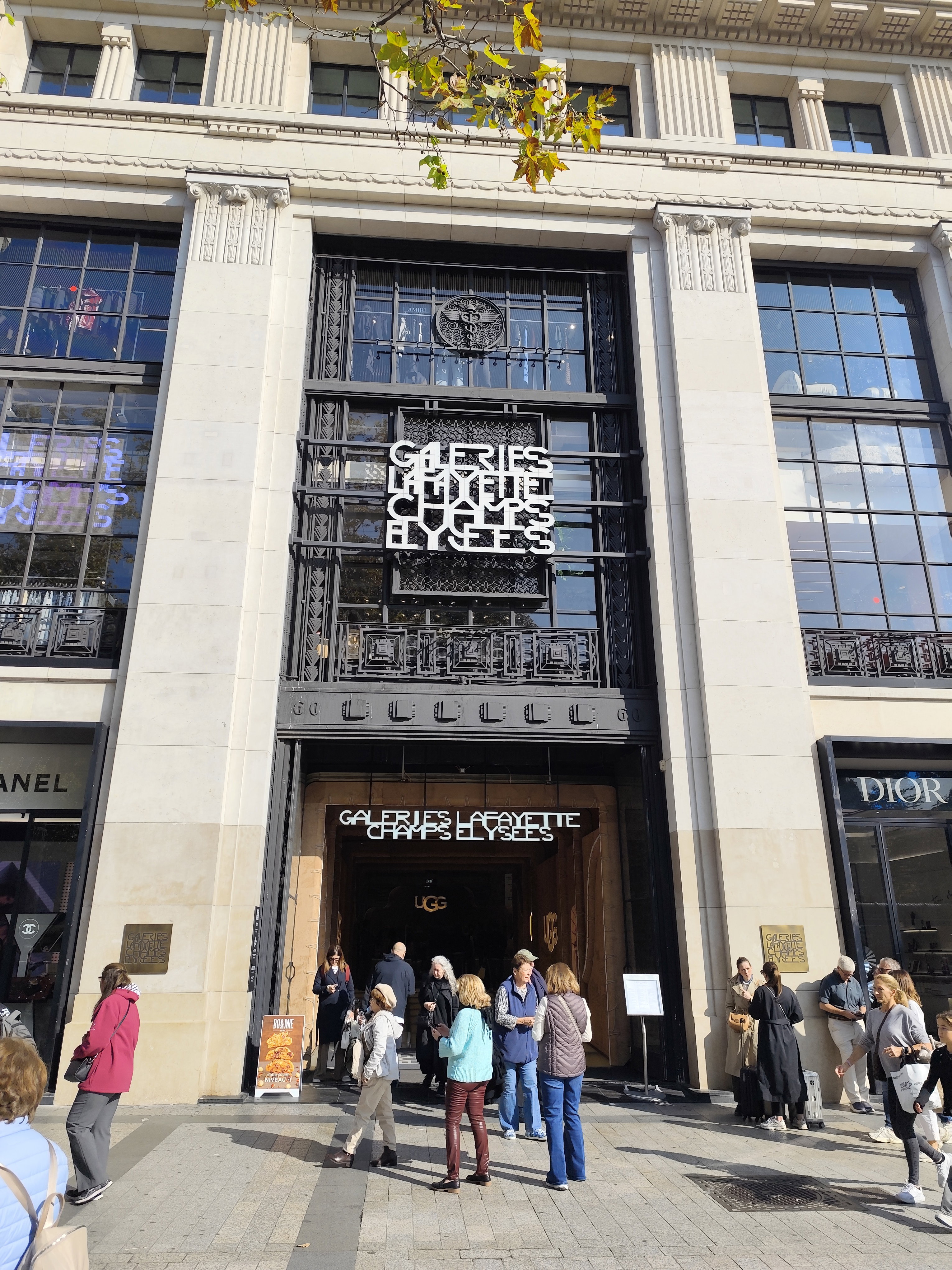 Магазины на Елисейских полях именуются торговыми галереями. «Galeries Lafayette Champs-Élysées», в отличие от исторического собрата «Galeries Lafayette Haussmann» с его знаменитым куполом, имеет современный дизайн, но тоже предлагает широкий ассортимент товаров только класса люкс, включая таких брендов, как Chanel и Dior, вывески которых красуются на фасаде.