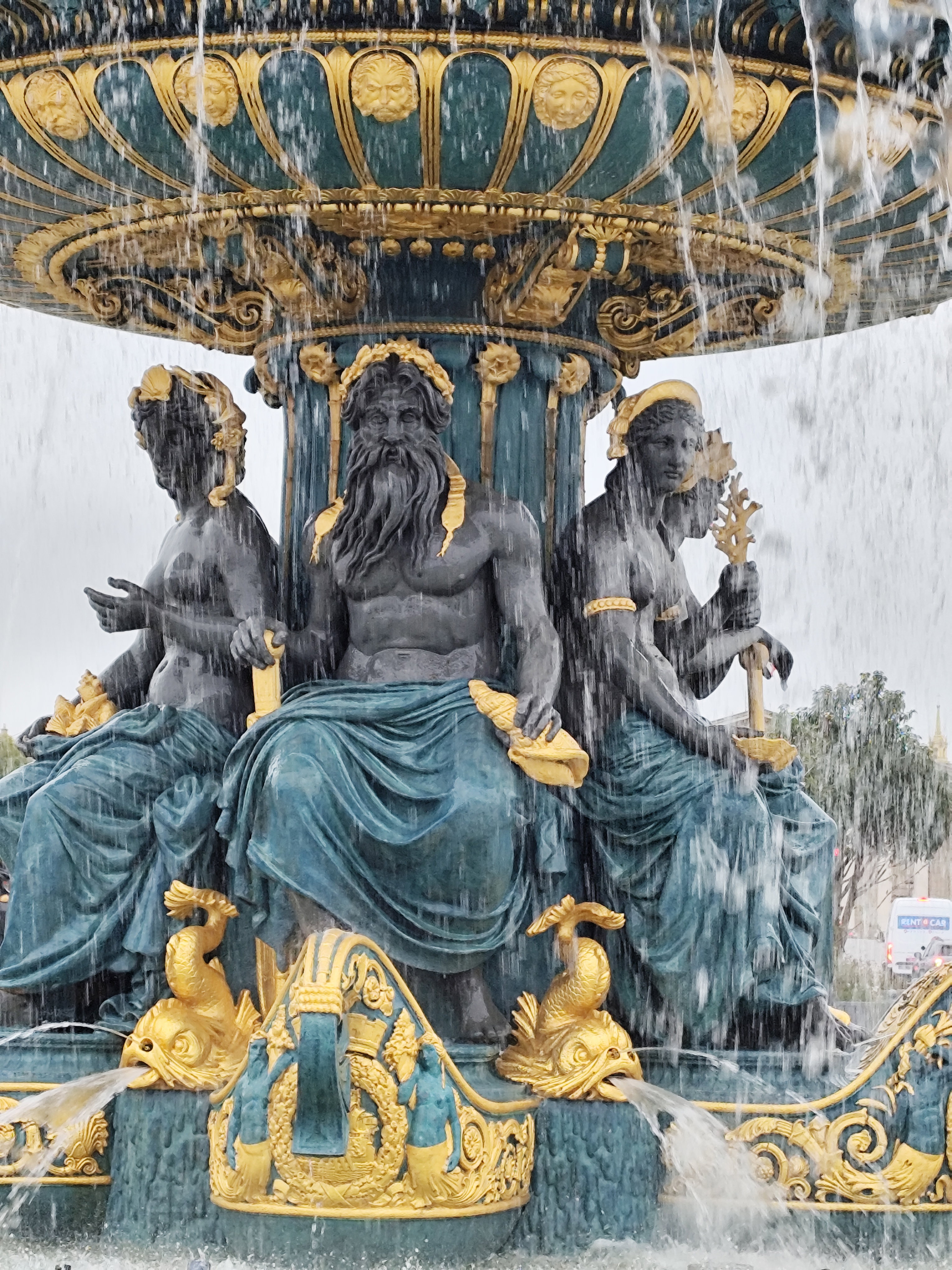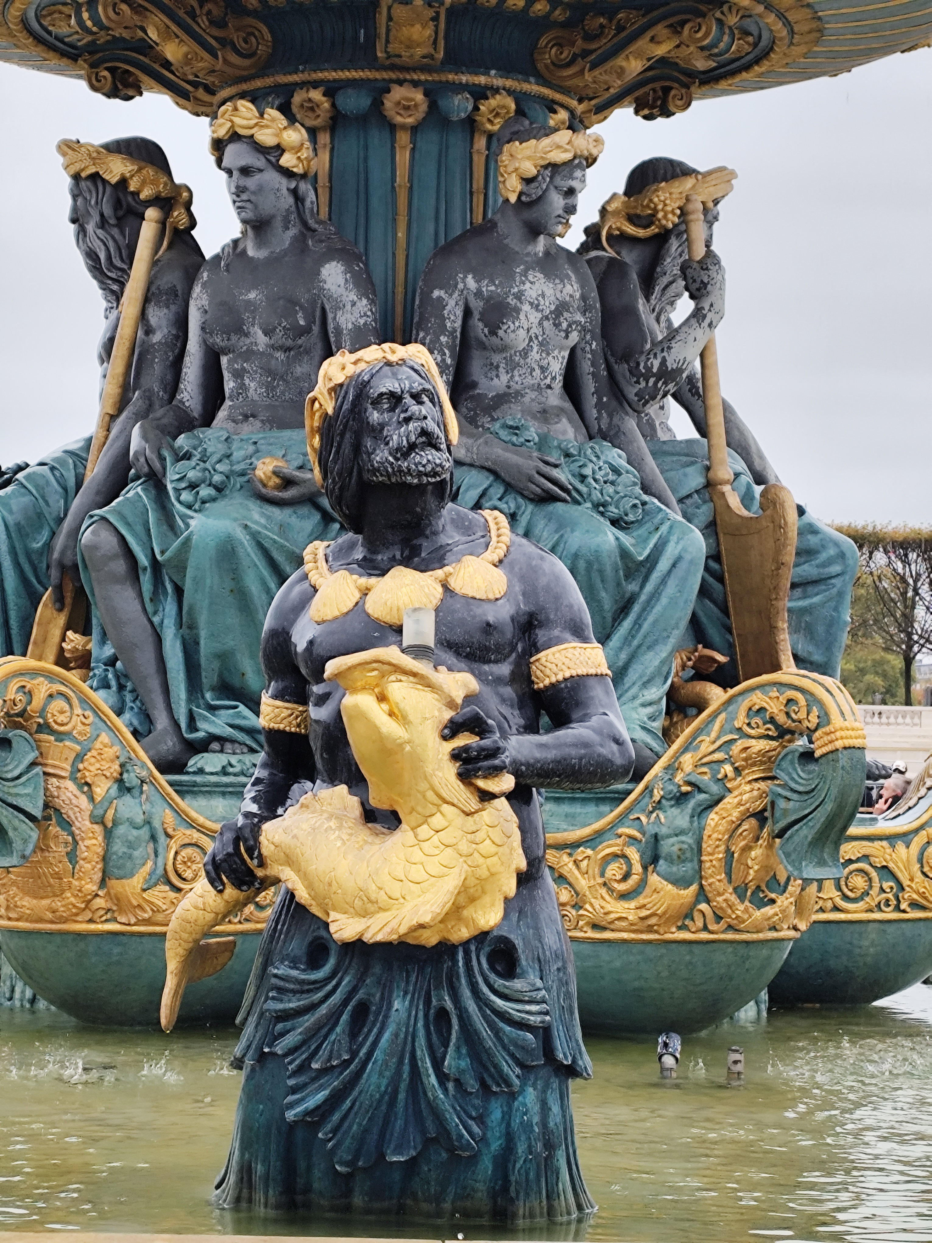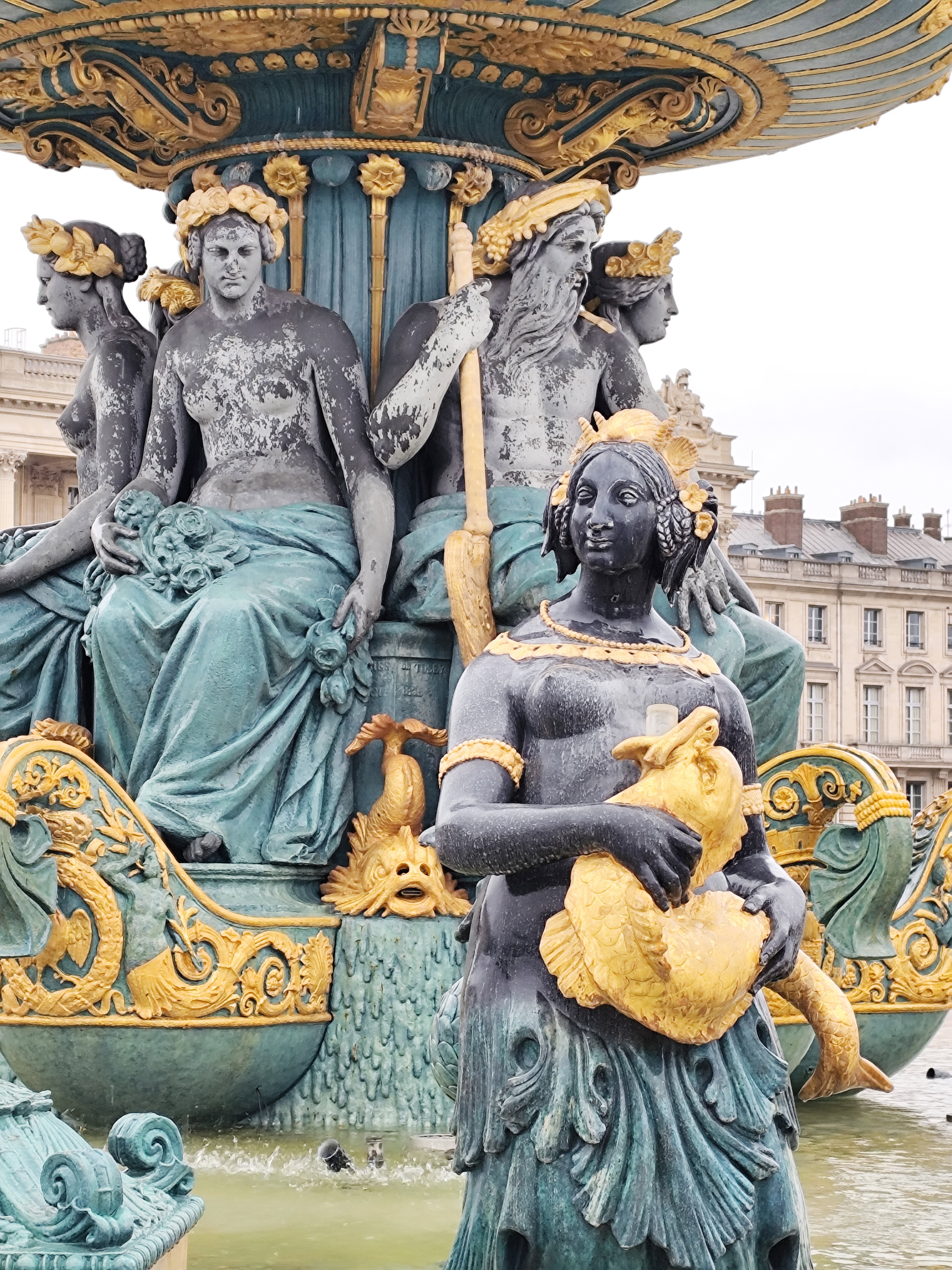 Решительно изменился облик площади в 1836 году, когда ее украсили двумя монументальными фонтанами, 20 фонарными столбами с военно-морской символикой и 23-метровым египетским обелиском. Фонтан рек (верхние фото) символизирует речное судоходство Франции и украшен аллегорическими скульптурами, олицетворяющими реки Рейн и Рону, а также грузоперевозку продукции сельского хозяйства по французским рекам.