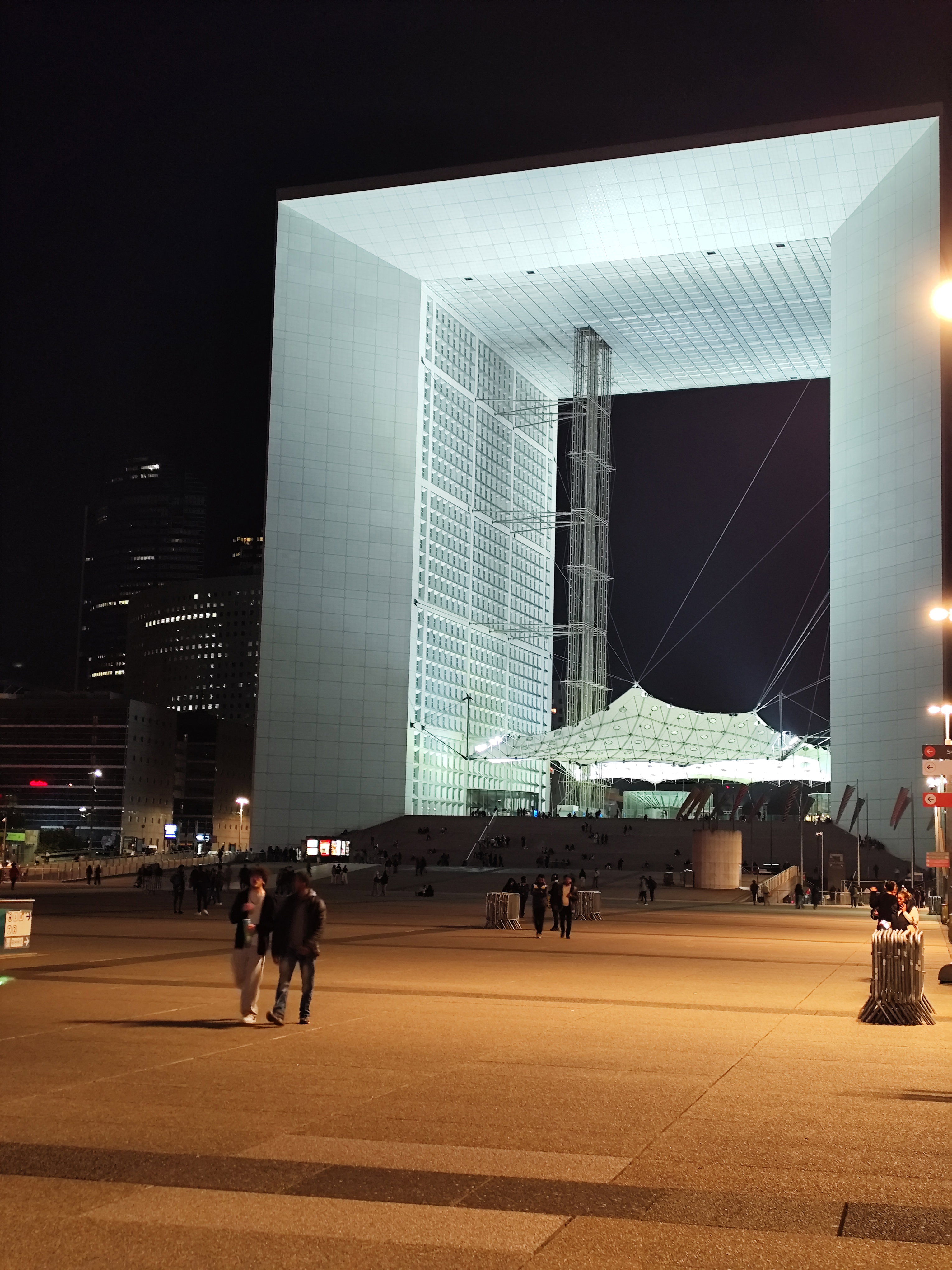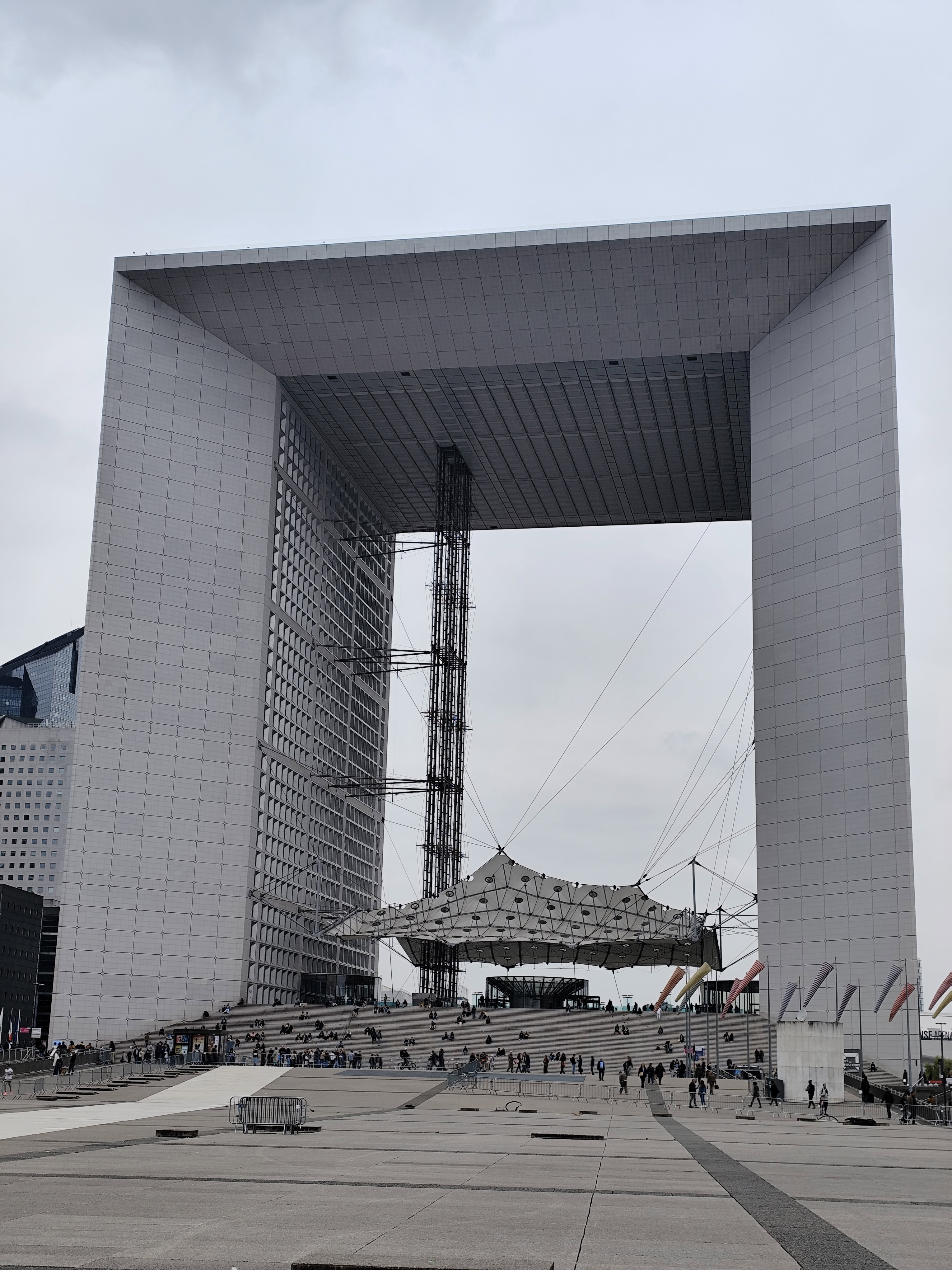 Большую арку в квартале Ла-Дефанс торжественно открыли в 1989 году по случаю 200-летия Французской революции. Считается, что в отличие от Триумфальной арки, возведенной в честь воинских побед Наполеона Бонапарта, Большая арка символизирует гуманистические идеалы и стремление к миру во всем мире. При этом оказалось, что расположение арки не совсем точно соответствует Исторической оси Парижа, отклоняясь от нее на 6,33 градуса. На это повлияли вполне объективные причины. Ведь арка, как и весь квартал Ла-Дефанс, стоят на гигантской бетонной платформе, под которой расположена вся транспортная инфраструктура – скоростная железная дорога, метро, автостанция и даже двухуровневая автострада с развязкой. Заметной проблемой стала также атмосферная турбулентность в центральной части арки. В результате, чтобы обезопасить туристов от ветра, была создана подвесная тентовая конструкция, которую местные жители назвали «облаком» Большой арки Дефанс.